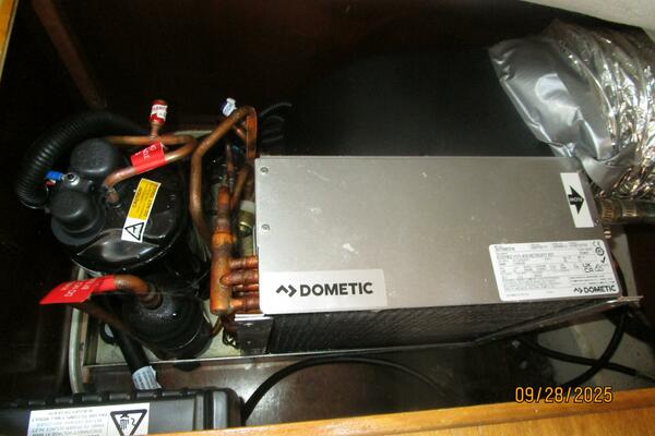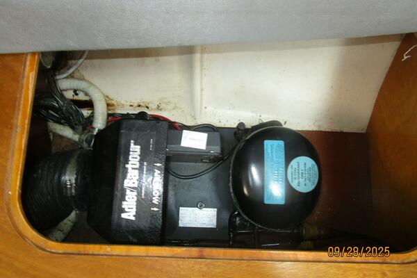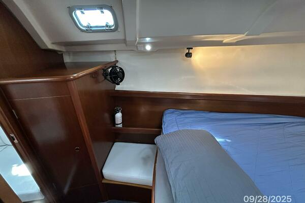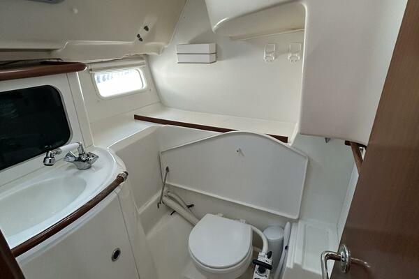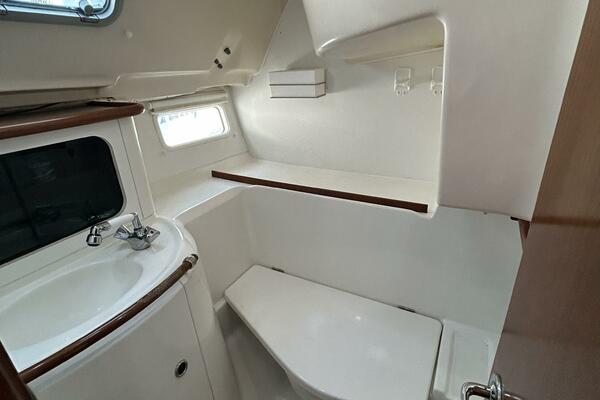 The aft stateroom offers a queen size berth, lower fixed portlight, 2 portlights, fan and hanging locker, shelf. The head is starboard aft.