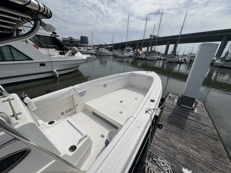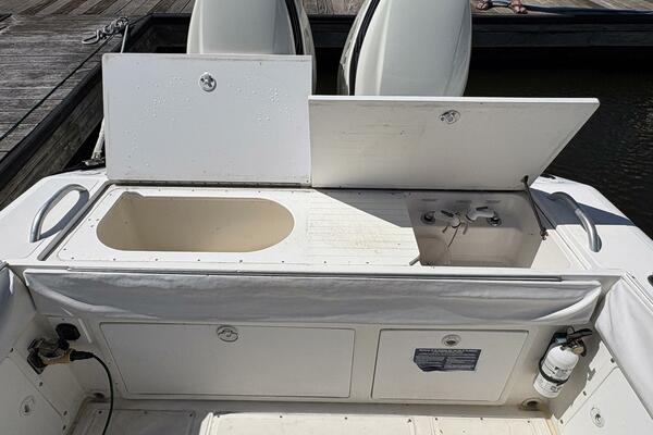 Head: The head compartment is thoughtfully integrated beneath the forward console, accessed via a lift-up hatch on the centerline. Inside, a marine toilet is neatly tucked within a molded fiberglass enclosure, providing privacy and convenience without encroaching on deck space.
