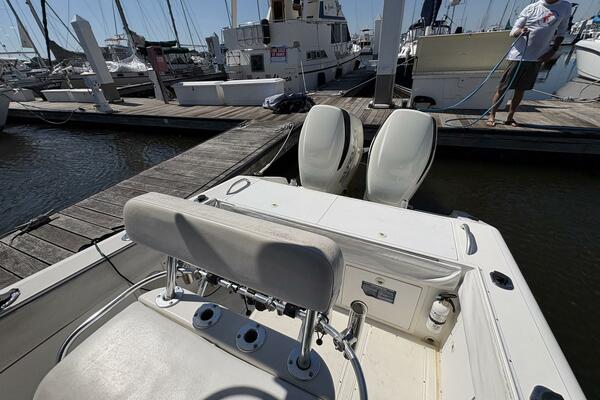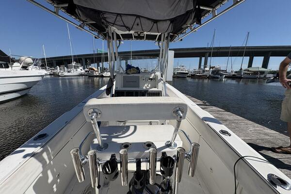 Cockpit: Rod Holders: Equipped with six rod holders on the gunnels, six additional holders on the leaning post, and four more at the back of the T-Top, offering ample storage and fishing capability.
