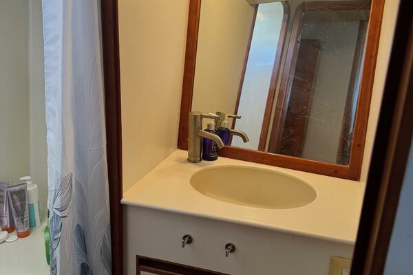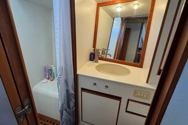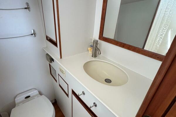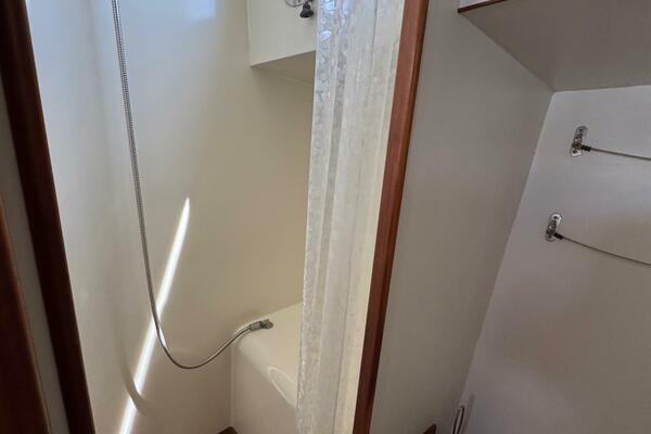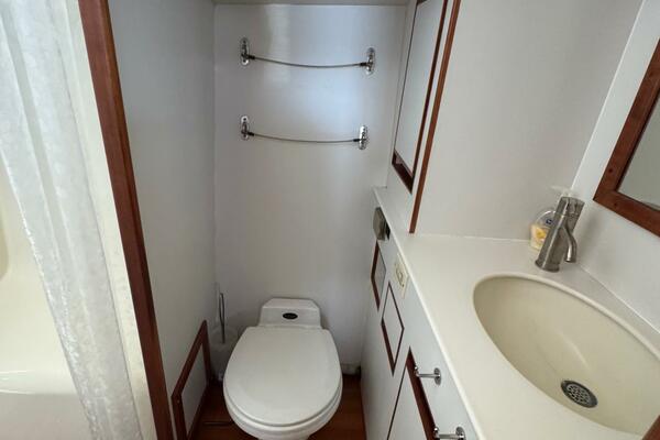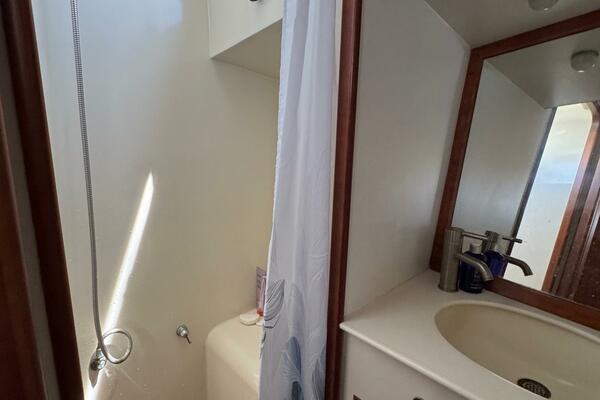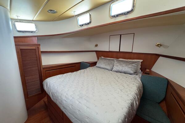 Located forward with a walkaround queen berth and new mattress (2023). Excellent storage includes dual hanging lockers, drawers, and a dresser. The ensuite head includes a stall shower.