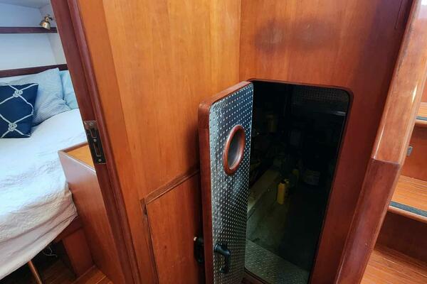 Amidships to port, the guest cabin doubles as a lounge or office with over/under bunks and built-in desk. Across the hall is the guest head and separate washer/dryer unit.