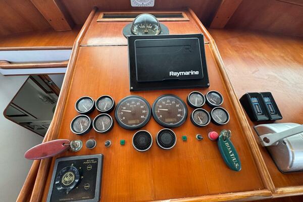 The salon features an L-shaped settee with a hi-lo teak table, large opening windows, and beautiful cherry joinery. The portside galley is open and well-equipped for cruising.
