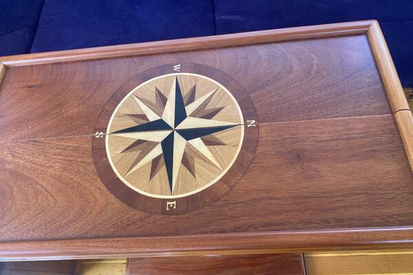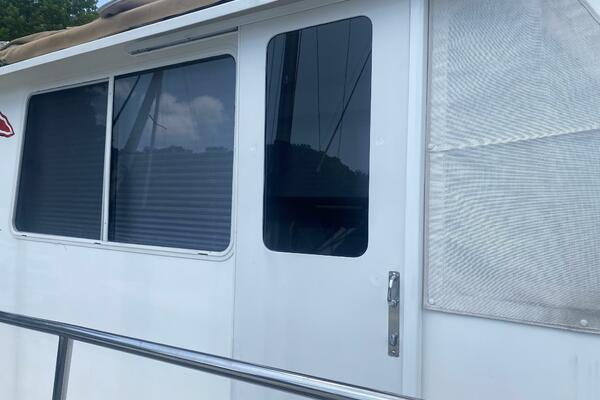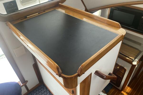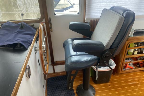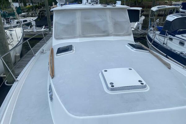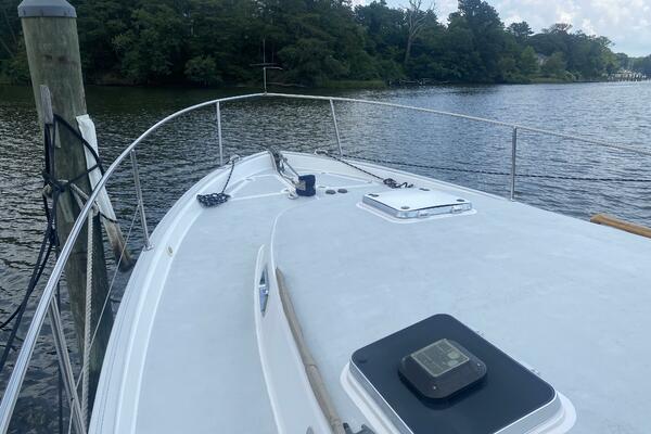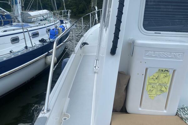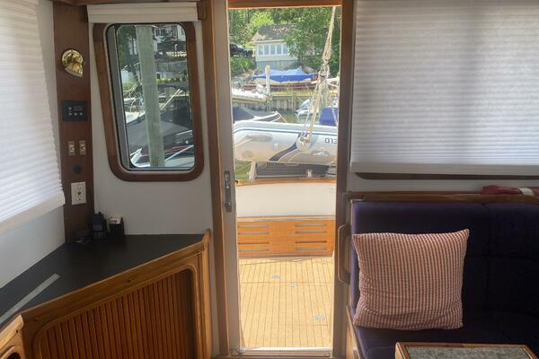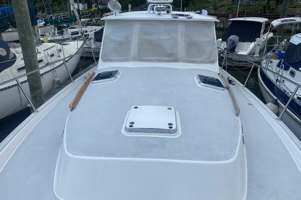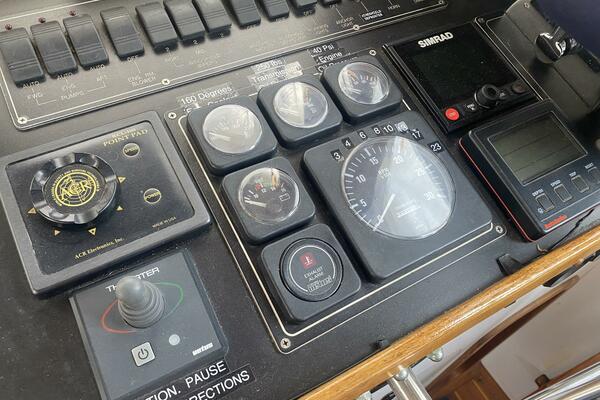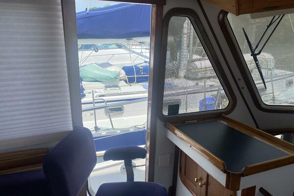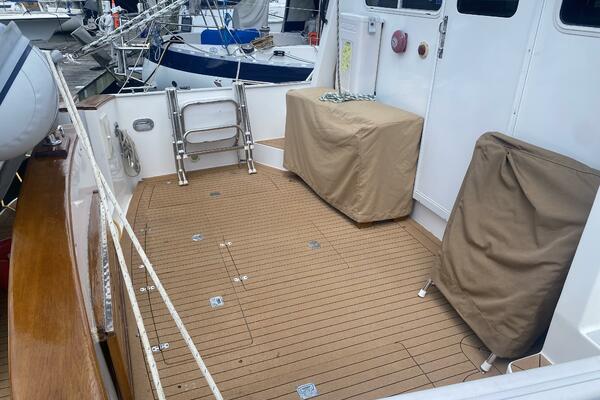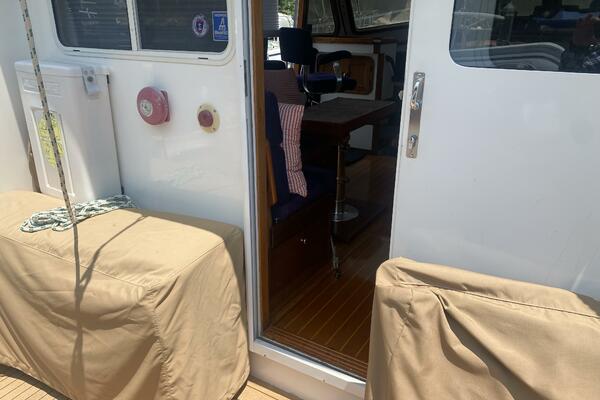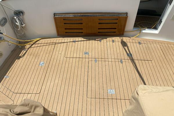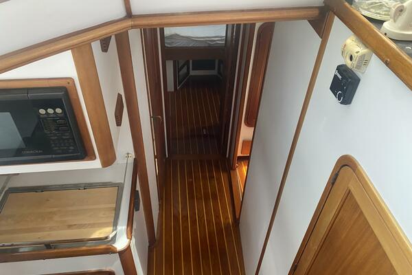 Varnished hand rails and aft coaming. Total engine hours: 2,343. Generator engine hours: 475