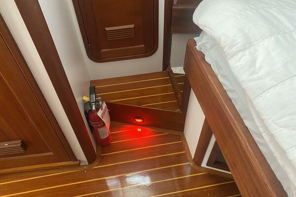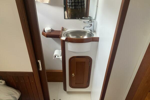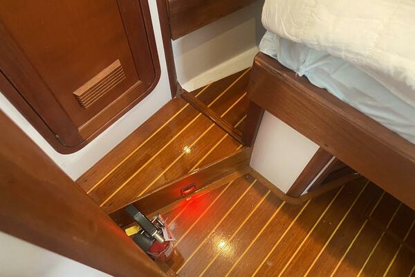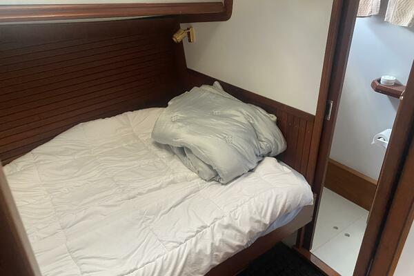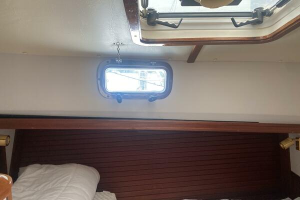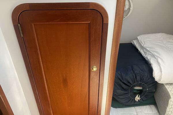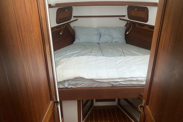 on both sides. Matching brass reading lights installed at forward end. New custom berth mattress,