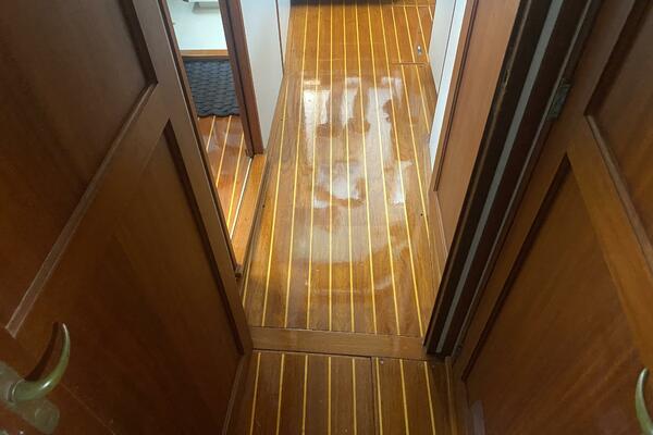April: Three cabin doors removed and wheel bearings replaced. Main salon cabin sole refinished.