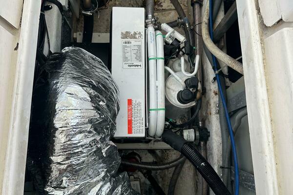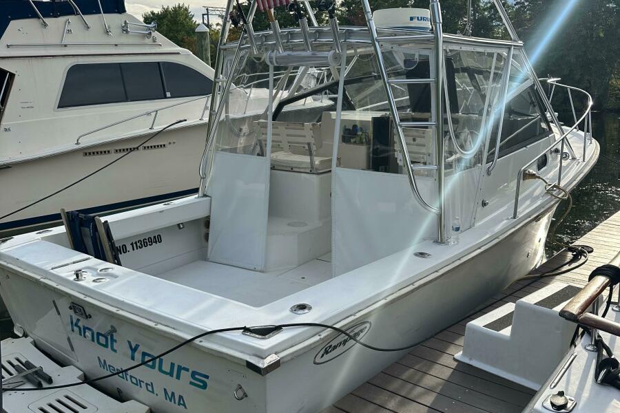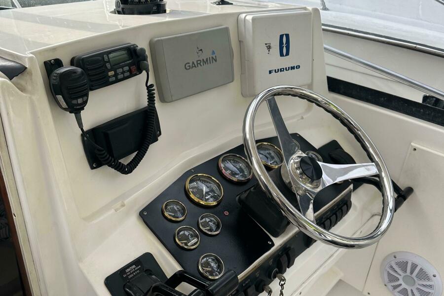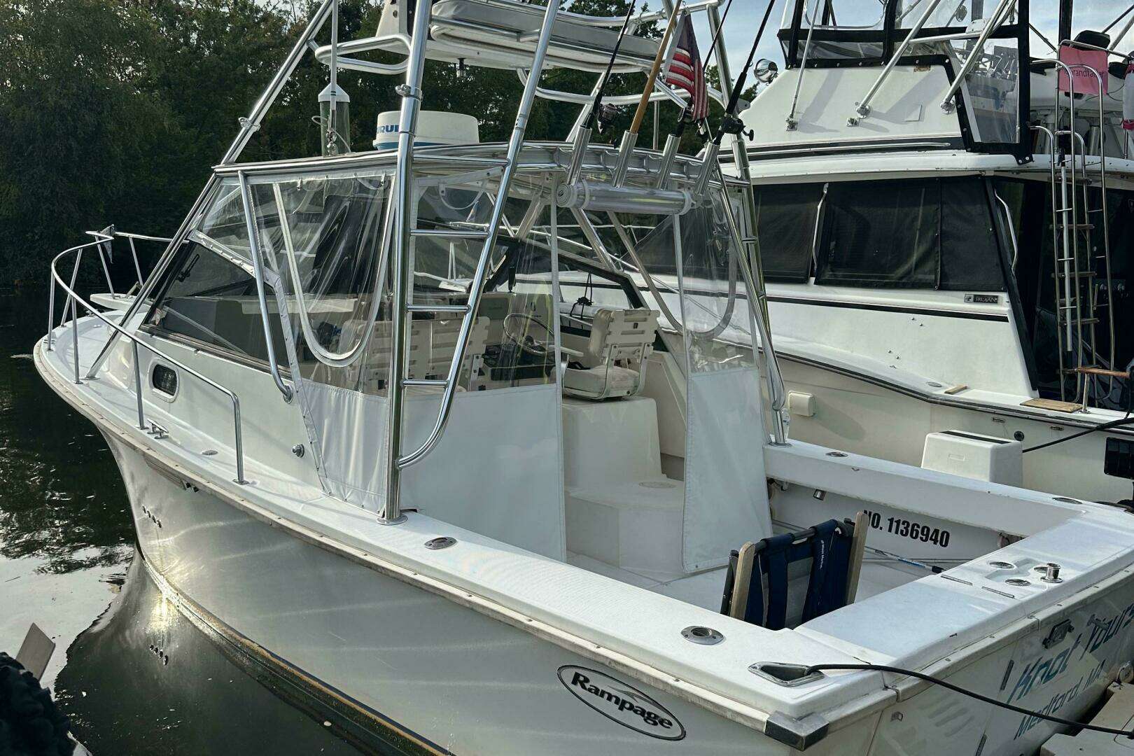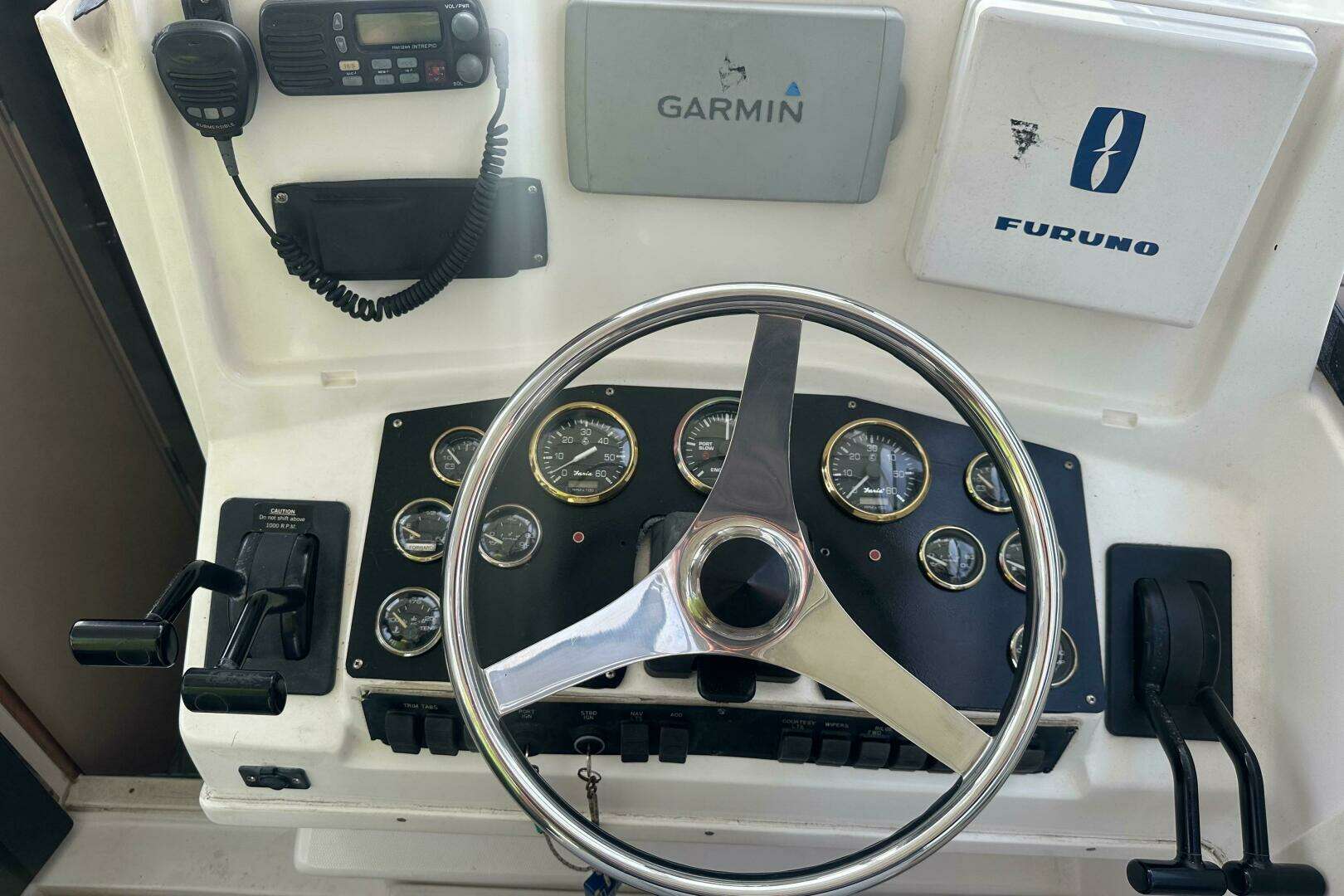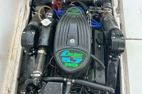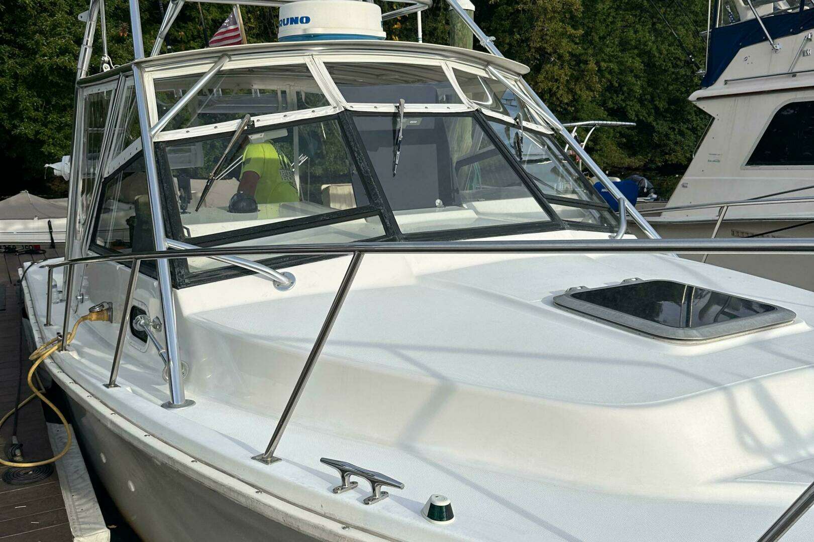 “Knot Yours” shows extremely well with clean fiberglass, modern SeaMax EFI fresh water cooled engines, Velvet Drive transmissions (recent manifolds/risers STBD & port reman 160 hrs). Flawless aluminum tower with full controls, a fiberglass hardtop, Lee outriggers and a 3 sided enclosure.