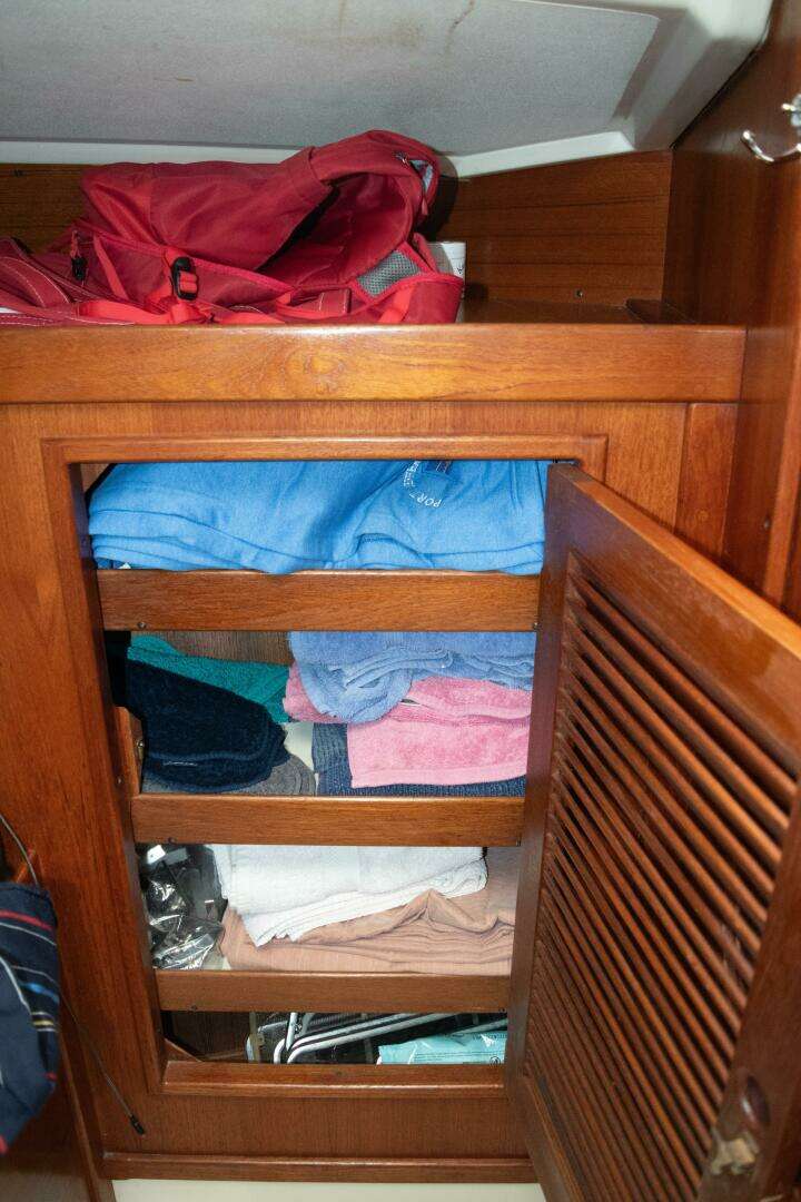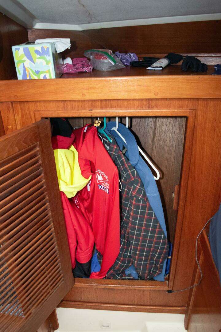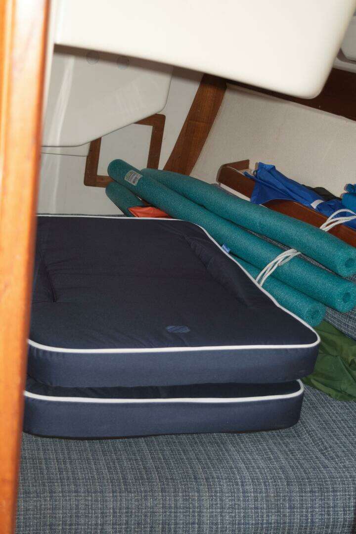 Two cabin one head layout with teak interior and LED lighting throughout. Forward vee berth with hanging locker and cabinet. Custom fitted sheets and mattress pads for forward and aft staterooms. Main cabin with fwd centerline fixed table with folding leafs, port & Stb berths. Comfortably sleeps six. Galley with center line sink, 3 burner propane stove and oven, refrigeration. Head with 2024 Jabsco quiet flush electric fresh water head, 2024 holding tank, shower, pressure hot & cold water system, macerator.