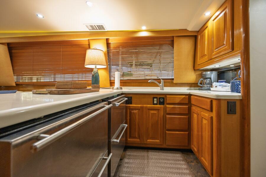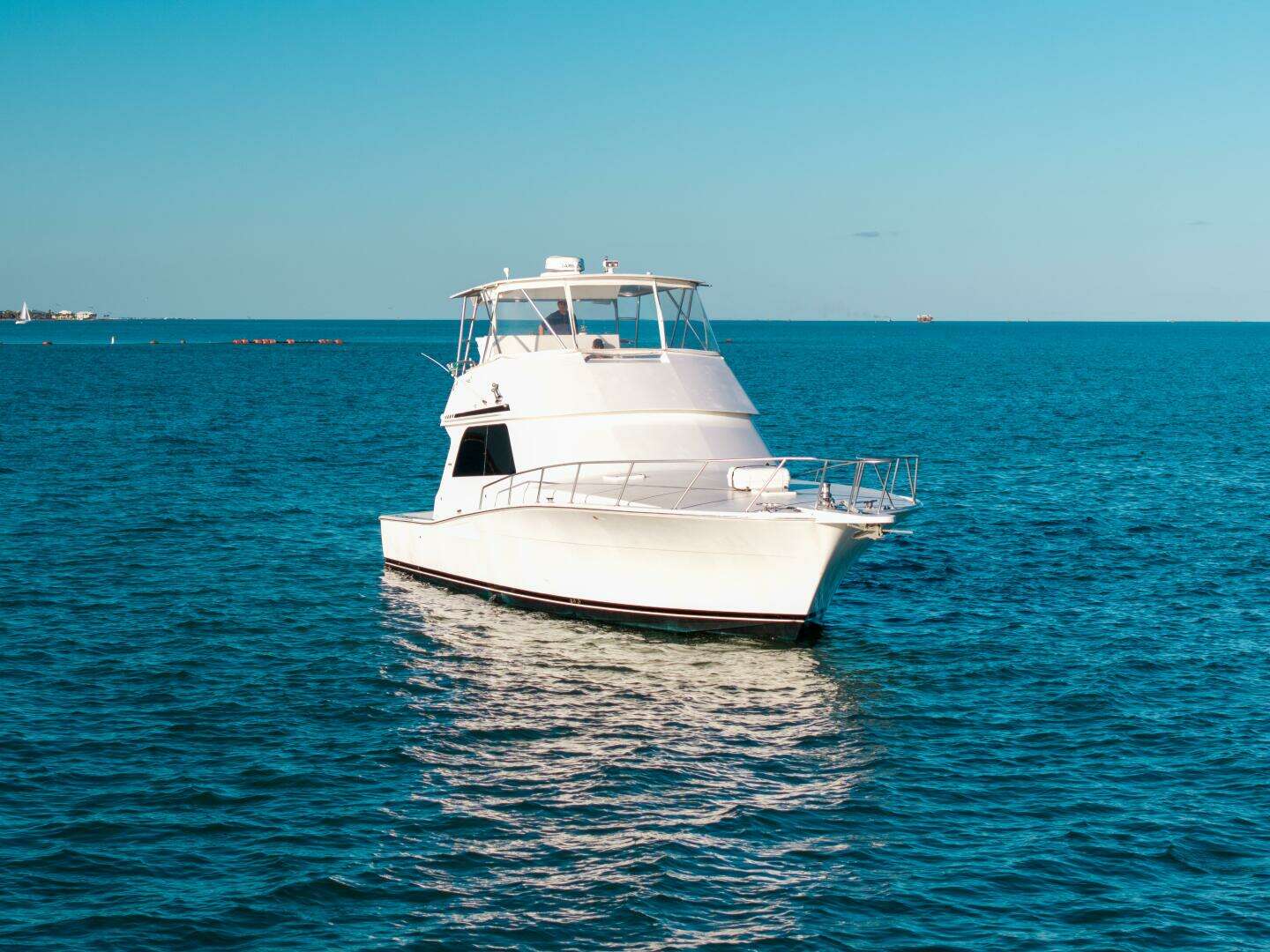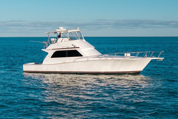 Introduced in 1991, the Viking 50 is best described as a scaled-down version of the Viking 53 Convertible introduced a few years earlier. She’s built on a modified-V hull with a relatively wide beam, a well-flared bow, and balsa coring in the hulls sides. Her lush three-stateroom layout is similar in most respects to her predecessor, but with reduced dimensions. The master stateroom is amidships, the place for washer & dryer has been converted to rod storage, the salon is open to the galley and a dinette. Notable features of the Viking 50 include a spacious, standup engine room, a huge in-deck fish box, direct cockpit engine room access, and a superb bridge layout with seating for eight. Updates in 1997 included newly styled frameless deckhouse windows and an extended flybridge. At nearly 60,000 pounds the Viking 50 is no lightweight. Standard power is with 820hp MANS making her one of the fastest boats in her class. (PowerBoat Guide)