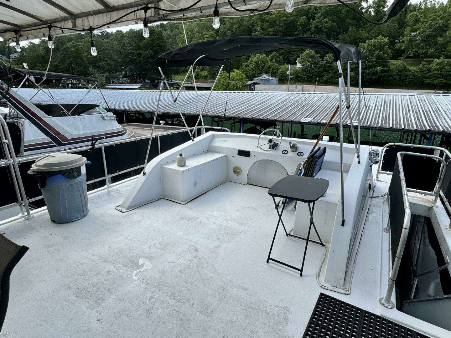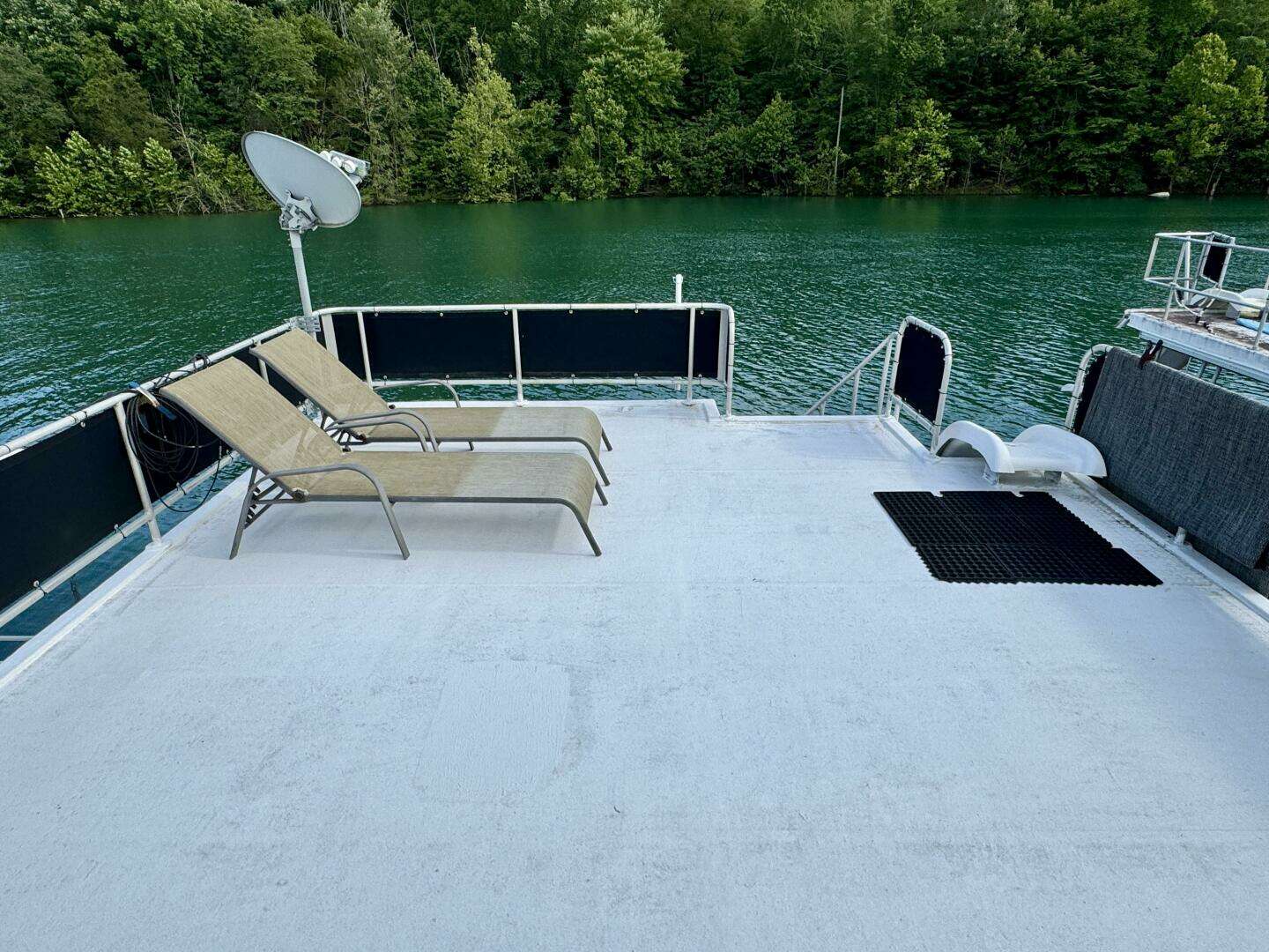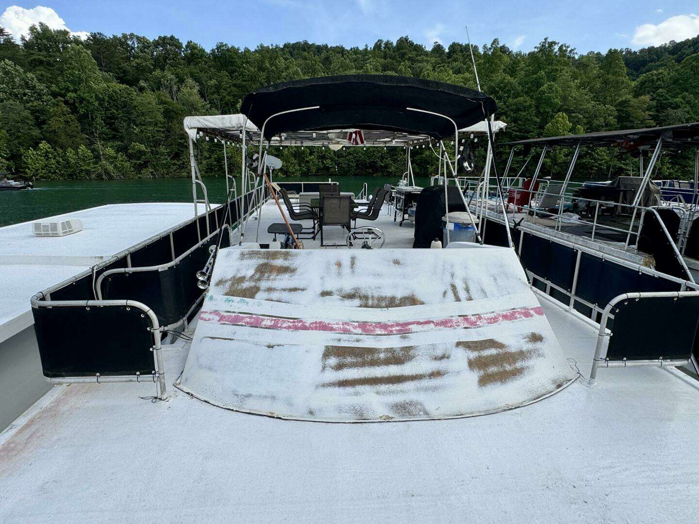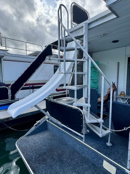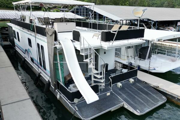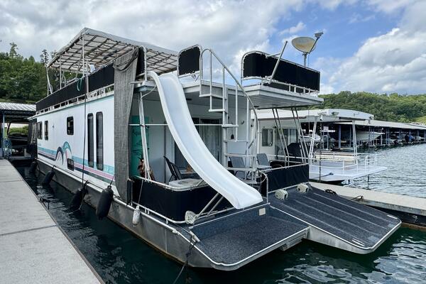 This 2nd Owner Aqua Chalet 16 x 68 Widebody Aluminum Hull Houseboat For Sale on Norris Lake Tennessee is equipped with twin 4.3L Mercruiser inboard/outboard engines and a 12.5KW Westerbeke generator and features 3 bedrooms, 2 full baths with a queen size master stateroom, 2 full size guest staterooms, plus a sleeper sofa, central heat/air conditioning hvac unit, a full galley with electric refrigerator/freezer, smooth top oven/range, dishwasher, otr microwave, a wet bar with a coffee maker, updated interior with LVP flooring throughout, a front isinglass canvas enclosure with screened windows and privacy curtains, a canvas party top with a dual helm flybridge, gas grill, gas griddle/cooktop, a water slide, extended swim platform, gas firpit, patio furniture, and much more - including a transferable slip on Norris Lake TN at the Pirate Bar Marina with a Floating Water Park for the 2025 season!
