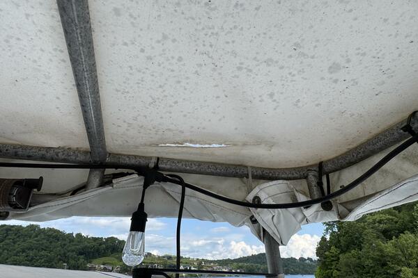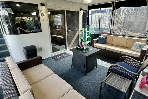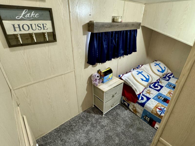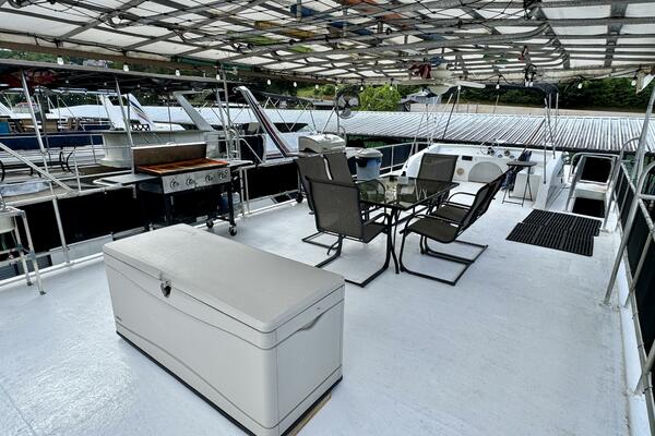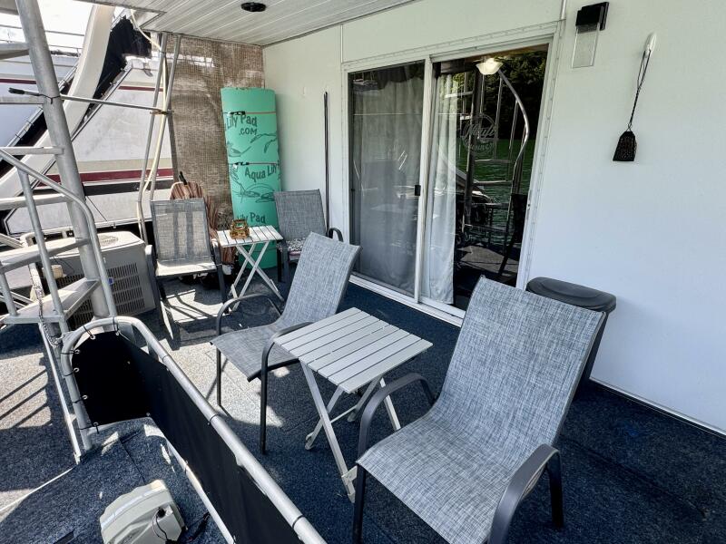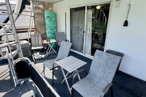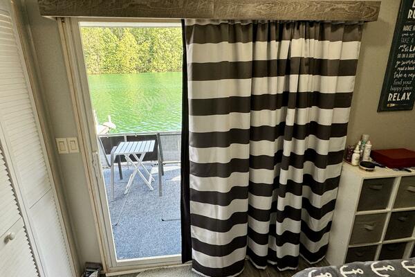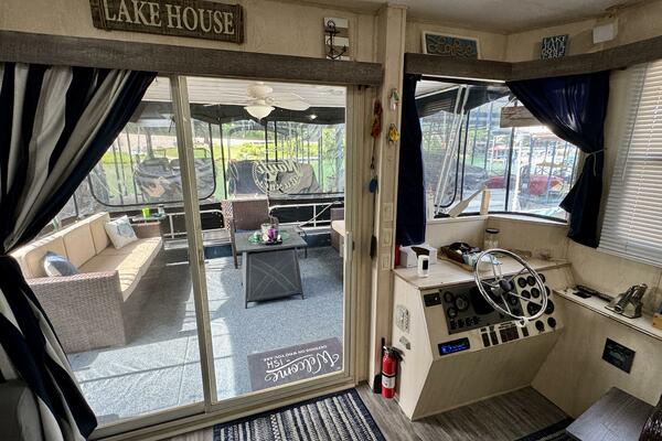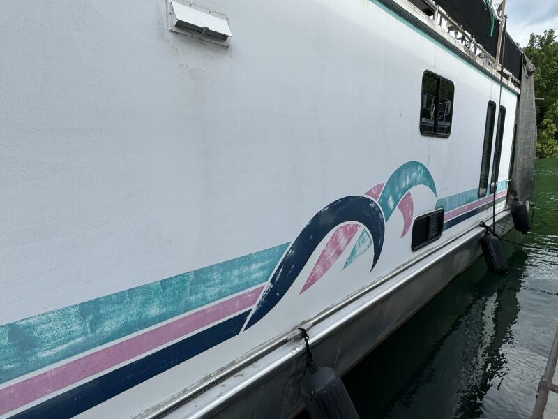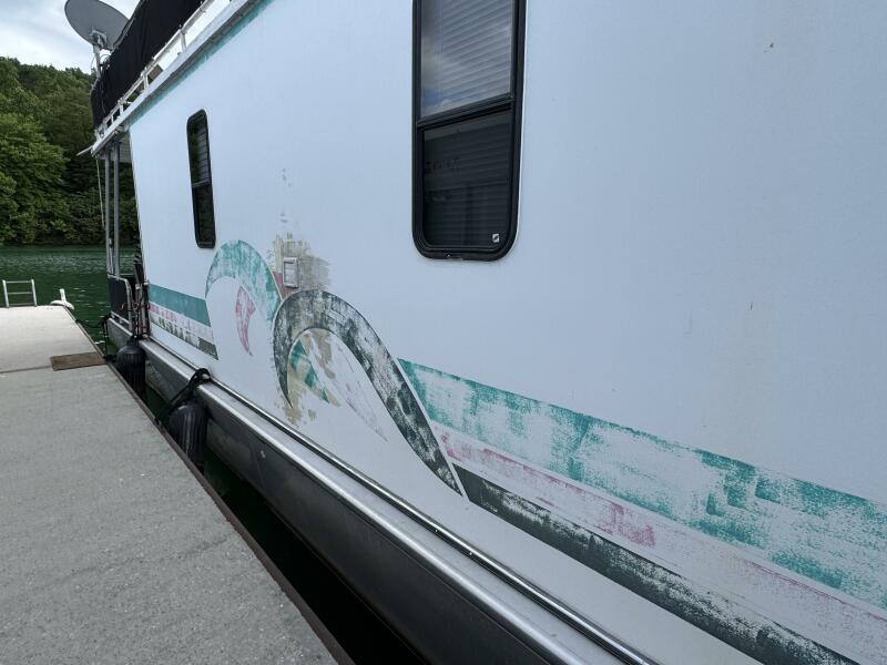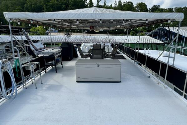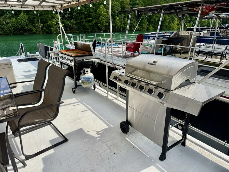 This 2nd Owner Aqua Chalet 16 x 68 Widebody Aluminum Hull Houseboat For Sale on Norris Lake Tennessee is equipped with twin 4.3L Mercruiser inboard/outboard engines and a 12.5KW Westerbeke generator and features 3 bedrooms, 2 full baths with a queen size master stateroom, 2 full size guest staterooms, plus a sleeper sofa, central heat/air conditioning hvac unit, a full galley with electric refrigerator/freezer, smooth top oven/range, dishwasher, otr microwave, a wet bar with a coffee maker, updated interior with LVP flooring throughout, a front isinglass canvas enclosure with screened windows and privacy curtains, a canvas party top with a dual helm flybridge, gas grill, gas griddle/cooktop, a water slide, extended swim platform, gas firpit, patio furniture, and much more - including a transferable slip on Norris Lake TN at the Pirate Bar Marina with a Floating Water Park for the 2025 season!