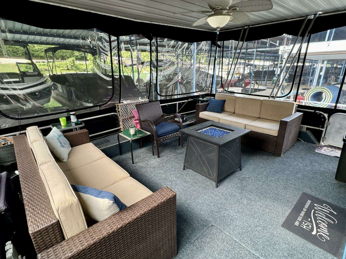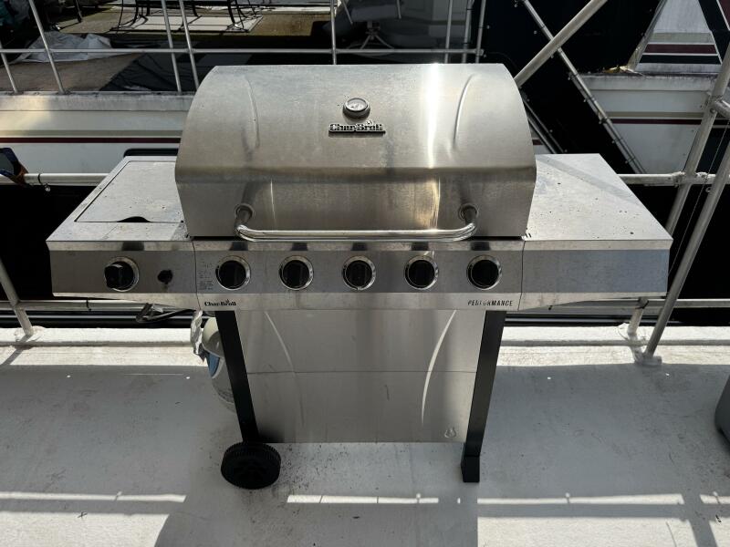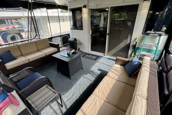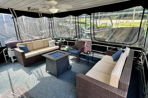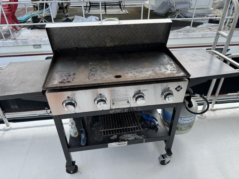 Dual Helm Flybridge w/Bimini Top, 16' Canvas Party Top, Bow Gangplank, Gas Fire Pit, Exterior Patio Furniture,