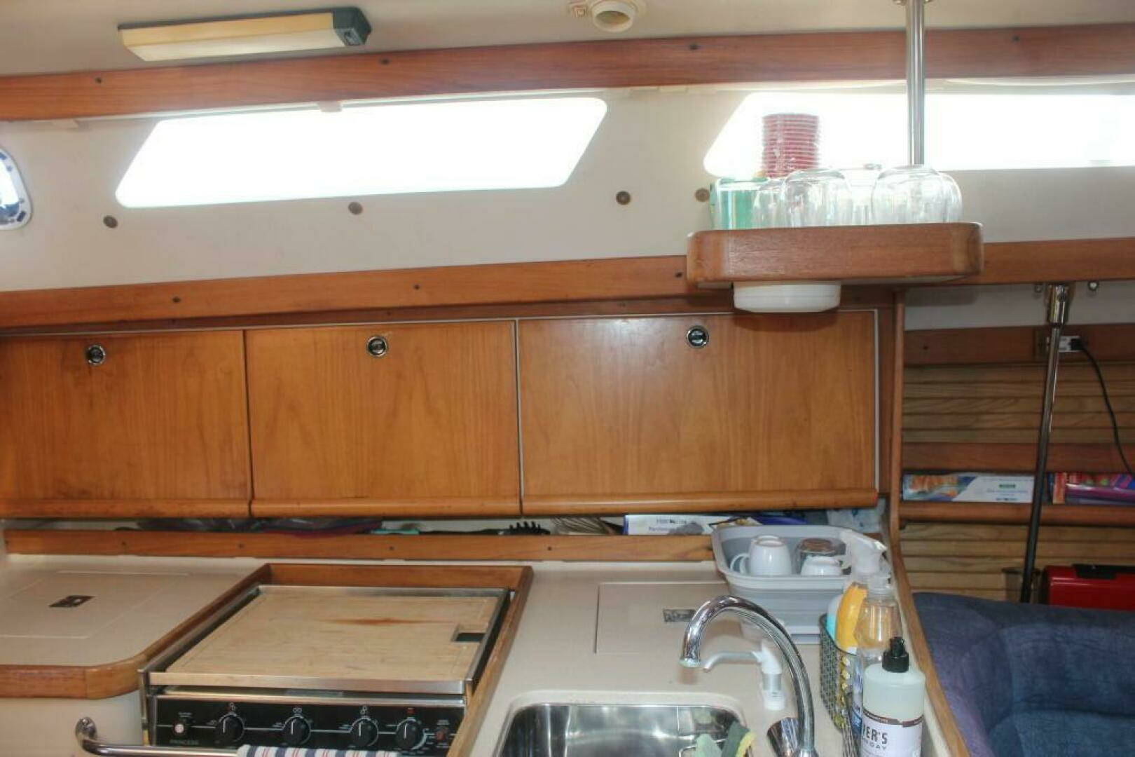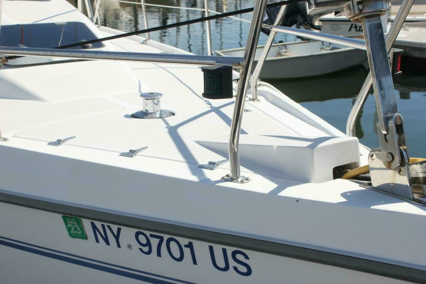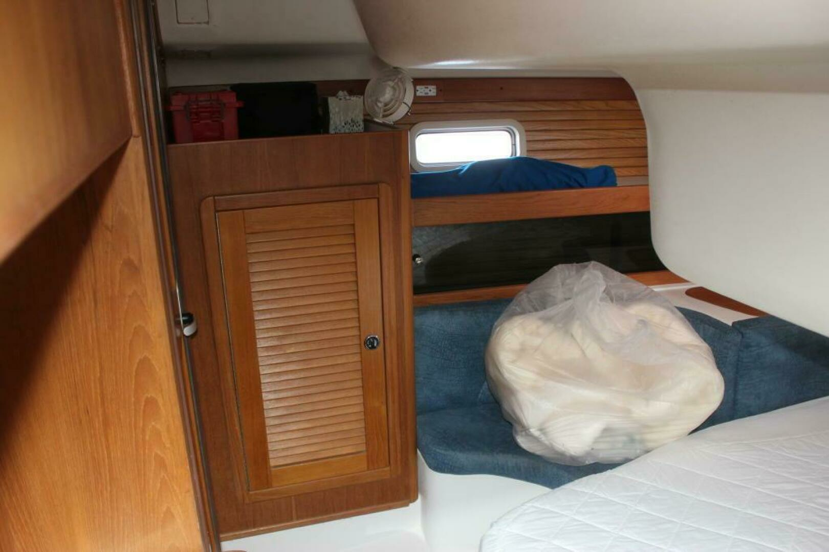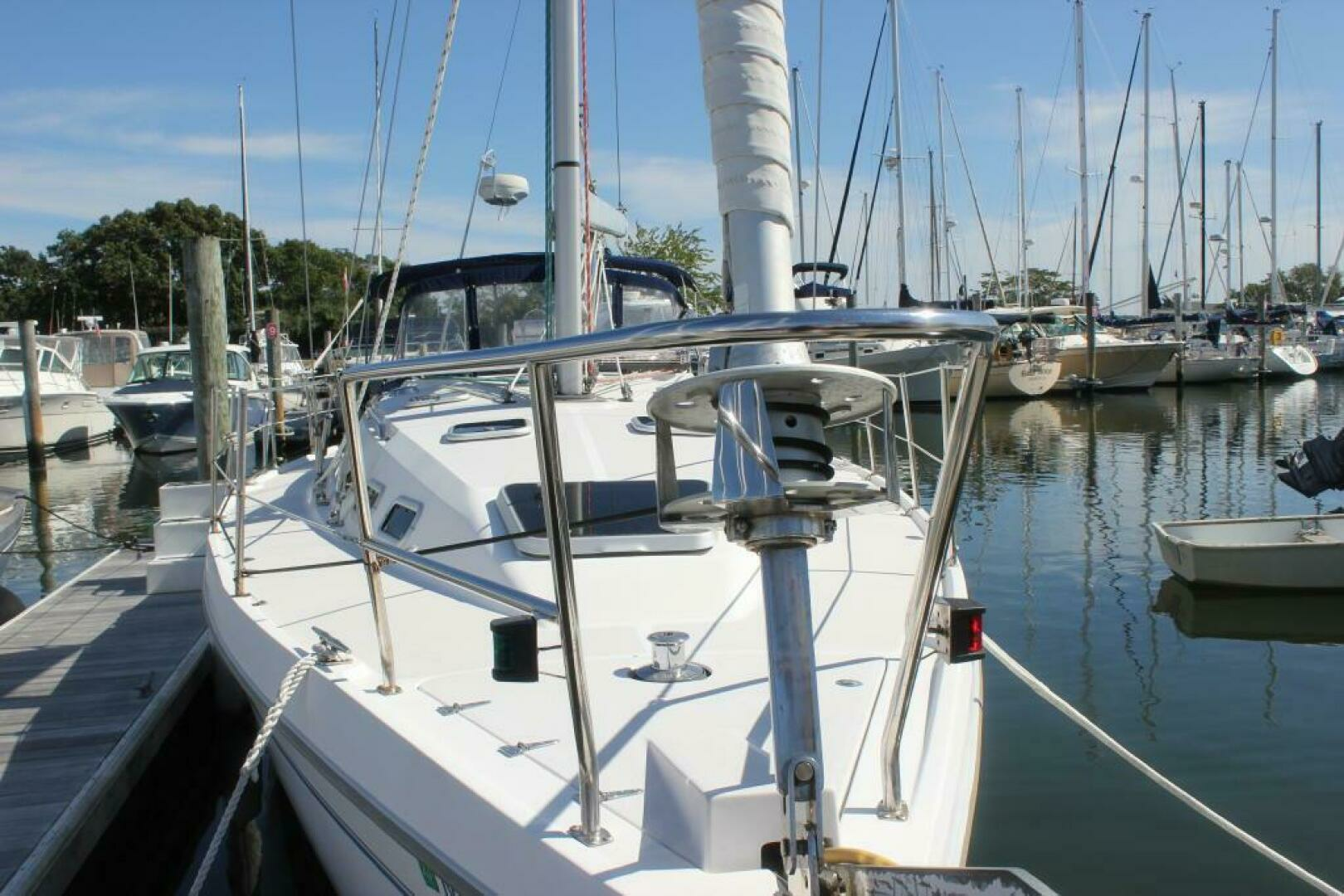 Sail La Vie interior features varnished teak bulkheads, cabinets and joinery. The aft owner’s cabin has seating and hanging lockers and private access to the head and the guest cabin is a V-Berth forward with a sink. Her salon has a U-shaped settee/berth to port with a dining table, settee to starboard, Nav Station midship to starboard and galley aft to port. The galley has refrigeration, 3-burner Princess propane stovetop/oven, SS sink and good storage. The head is aft of the Nav Station to starboard. She has an In-mast mail, roller furler on the jib/genoa. Her sail inventory is the in-mast main in good condition, jib in good condition and a 125% genoa in good condition. Her wing keel allows you to get into some areas the full keel can’t access. Her auxiliary power is a 42-HP Westerbeke diesel. She is in her slip in Greenport aand ready to go. Call for an appointment to see her.