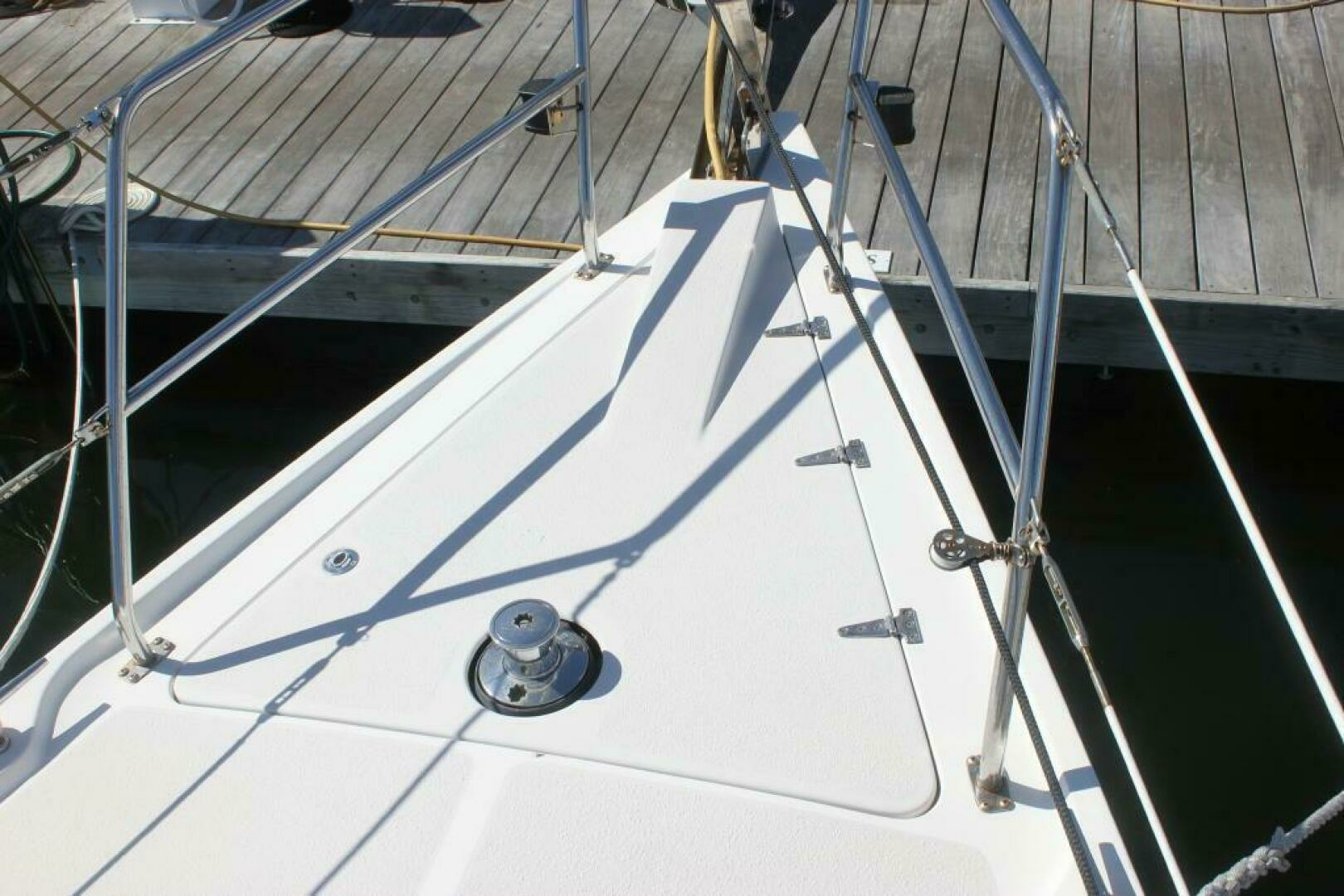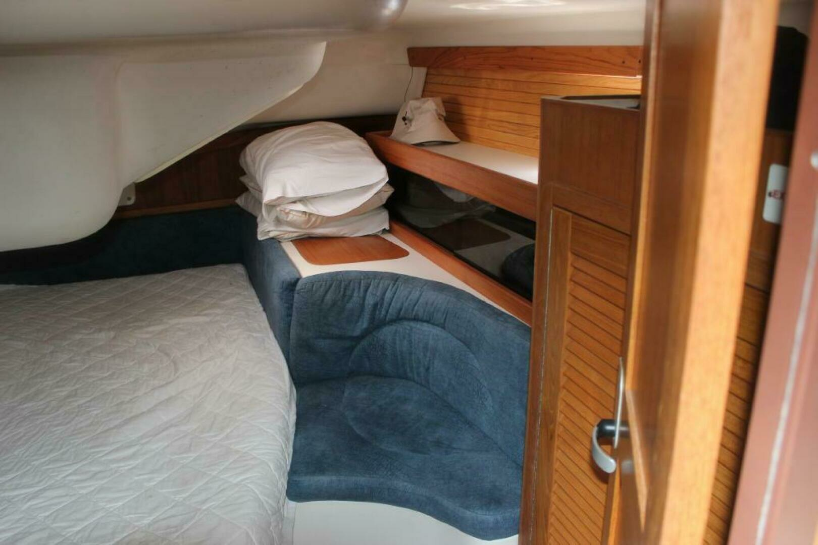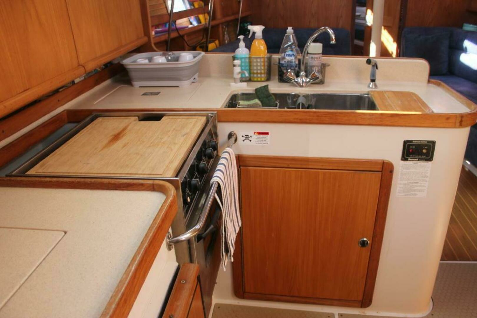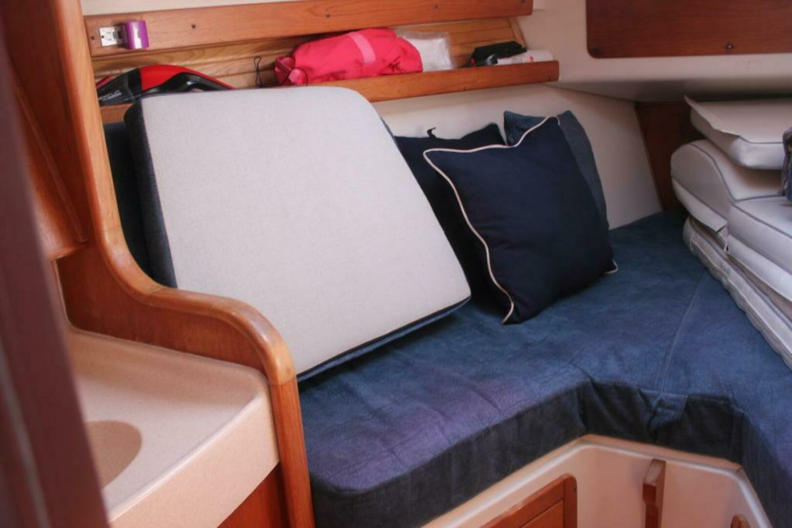 Sail La Vie interior features varnished teak bulkheads, cabinets and joinery. The aft owner’s cabin has seating and hanging lockers and private access to the head and the guest cabin is a V-Berth forward with a sink. Her salon has a U-shaped settee/berth to port with a dining table, settee to starboard, Nav Station midship to starboard and galley aft to port. The galley has refrigeration, 3-burner Princess propane stovetop/oven, SS sink and good storage. The head is aft of the Nav Station to starboard. She has an In-mast mail, roller furler on the jib/genoa. Her sail inventory is the in-mast main in good condition, jib in good condition and a 125% genoa in good condition. Her wing keel allows you to get into some areas the full keel can’t access. Her auxiliary power is a 42-HP Westerbeke diesel. She is in her slip in Greenport aand ready to go. Call for an appointment to see her.