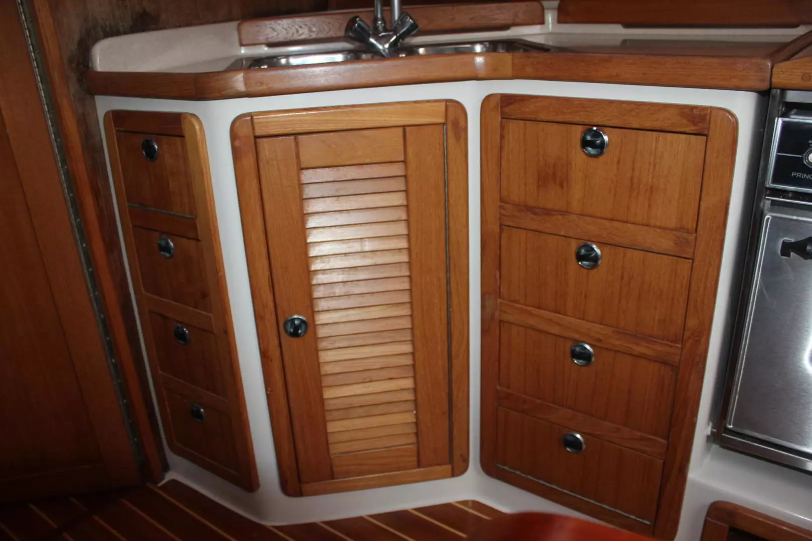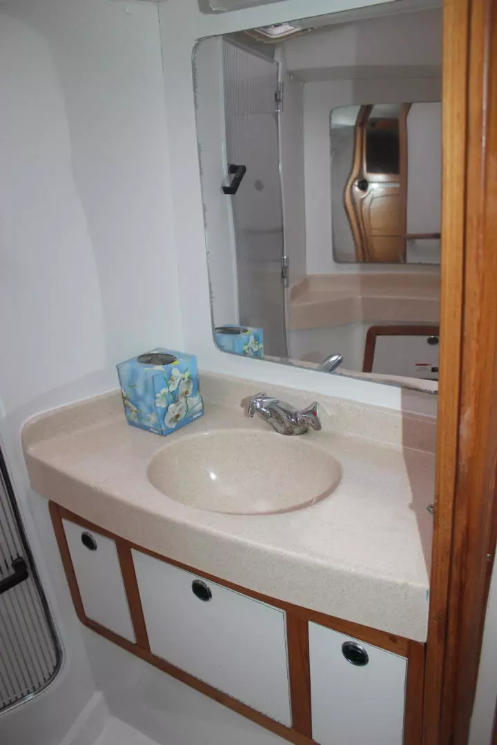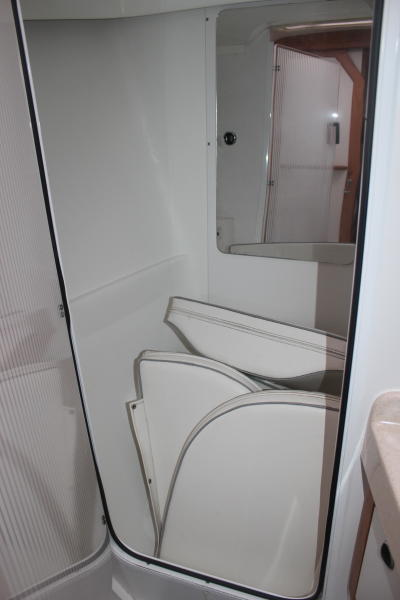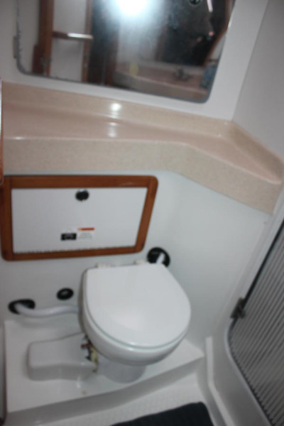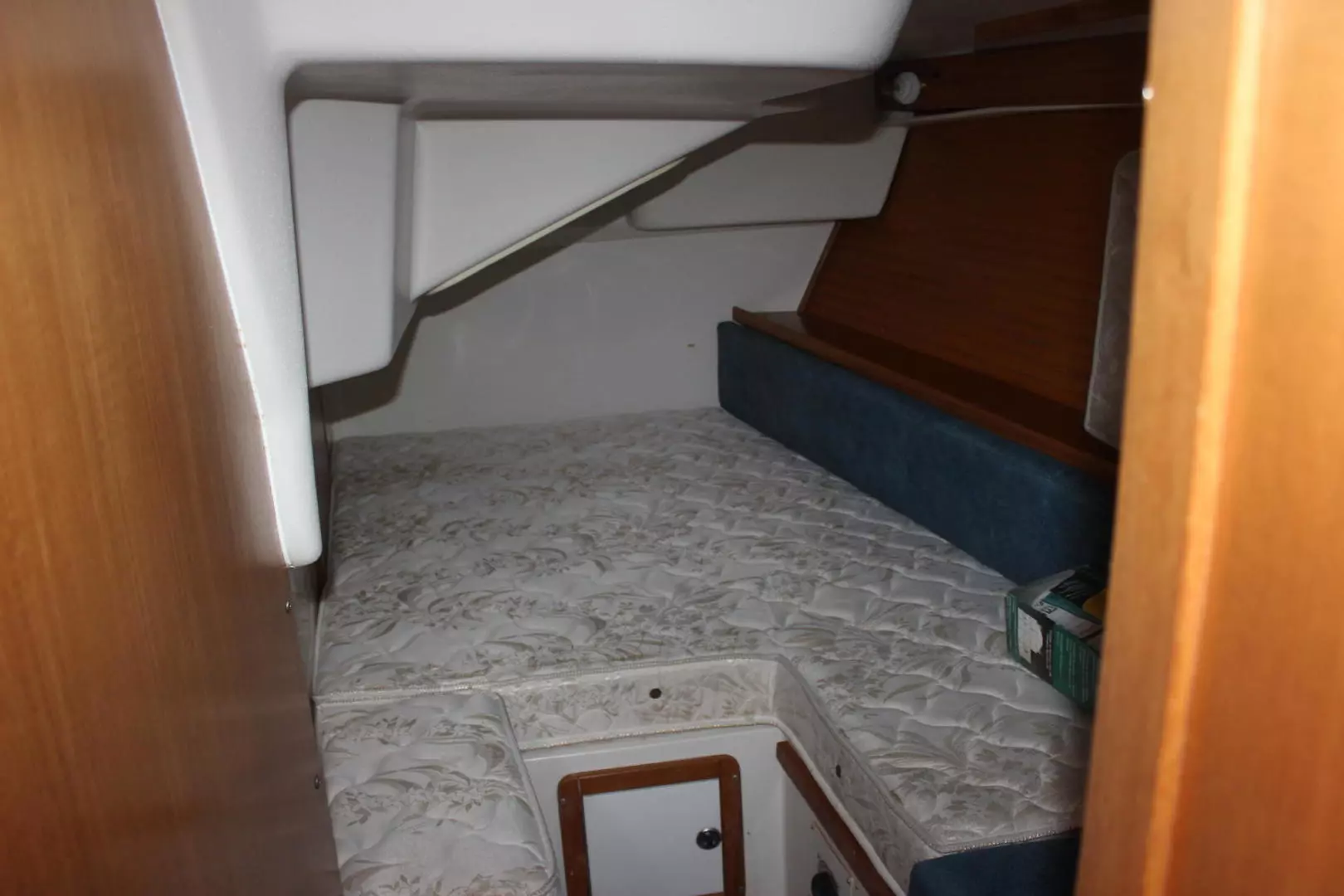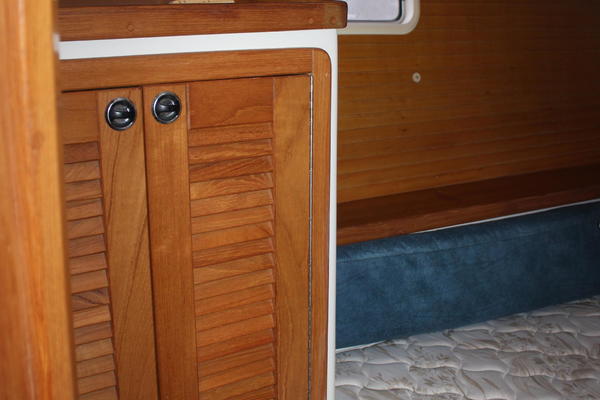 Roomy master stateroom forward has queen pullman-style berth to port with innerspring mattress. There are 2 extra large drawers beneath berth, cedar-lined hanging locker & drawers to starboard, 2 reading lights, en-suite head with opening overhead hatch & large shower stall forward.