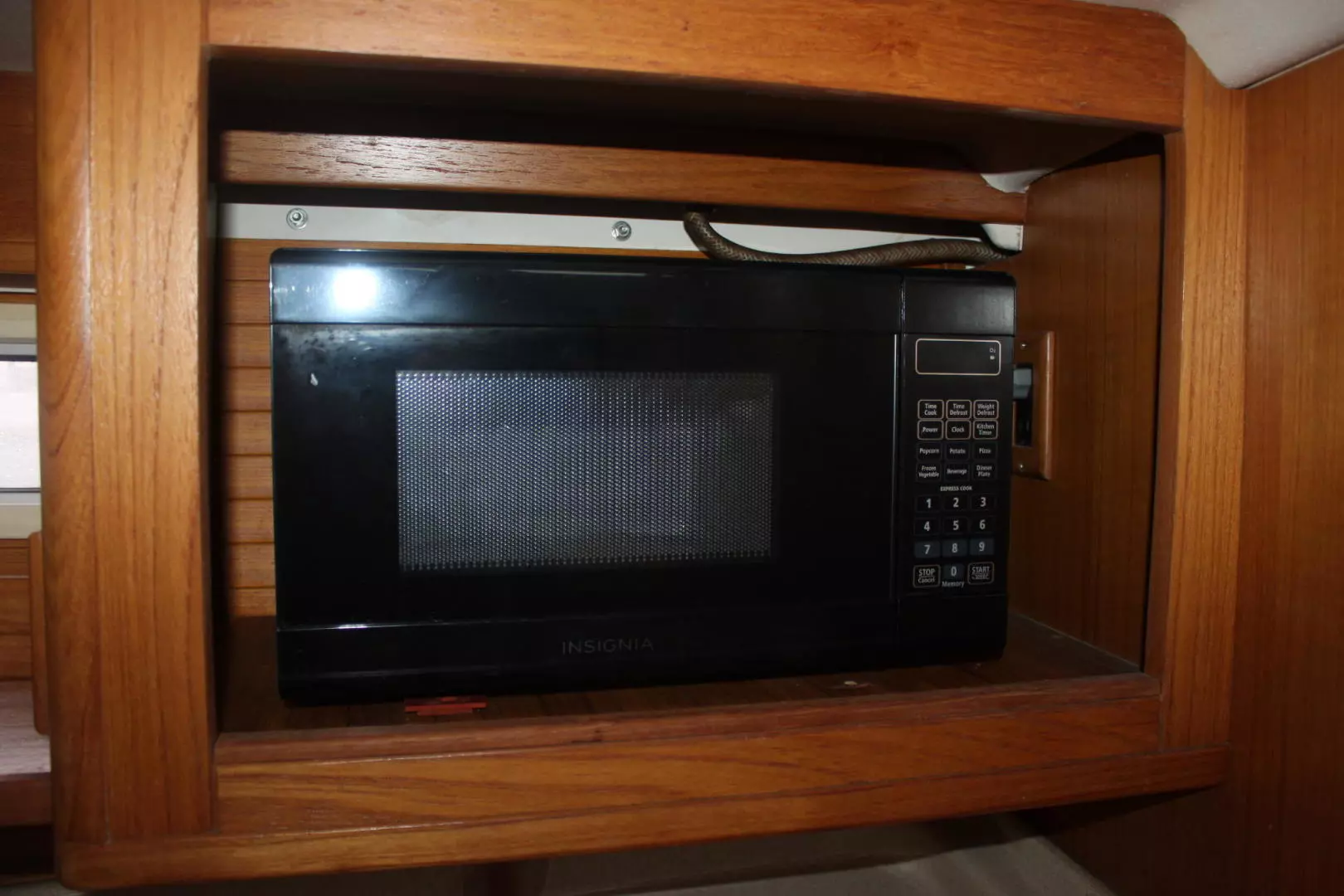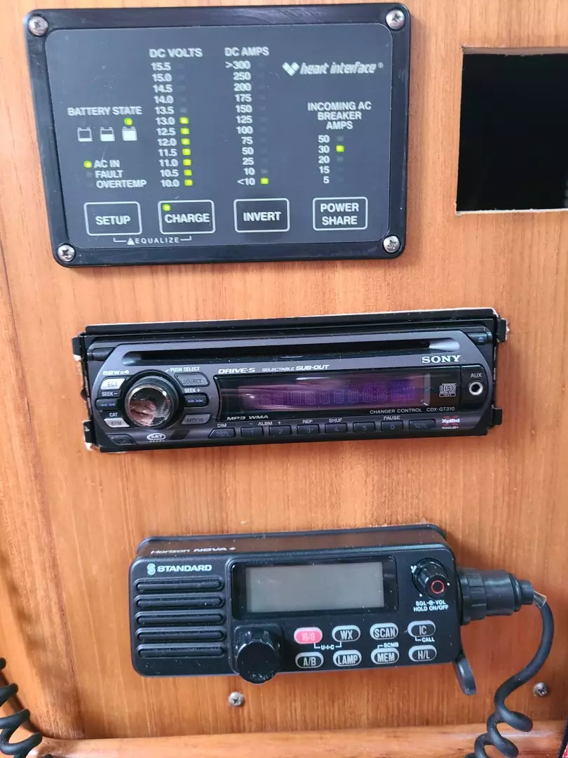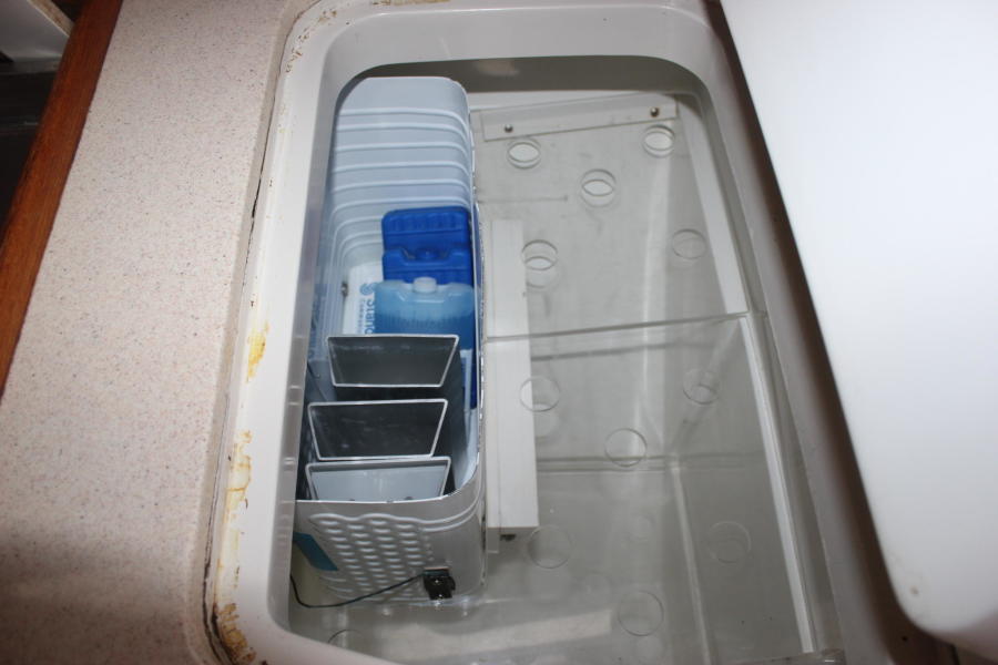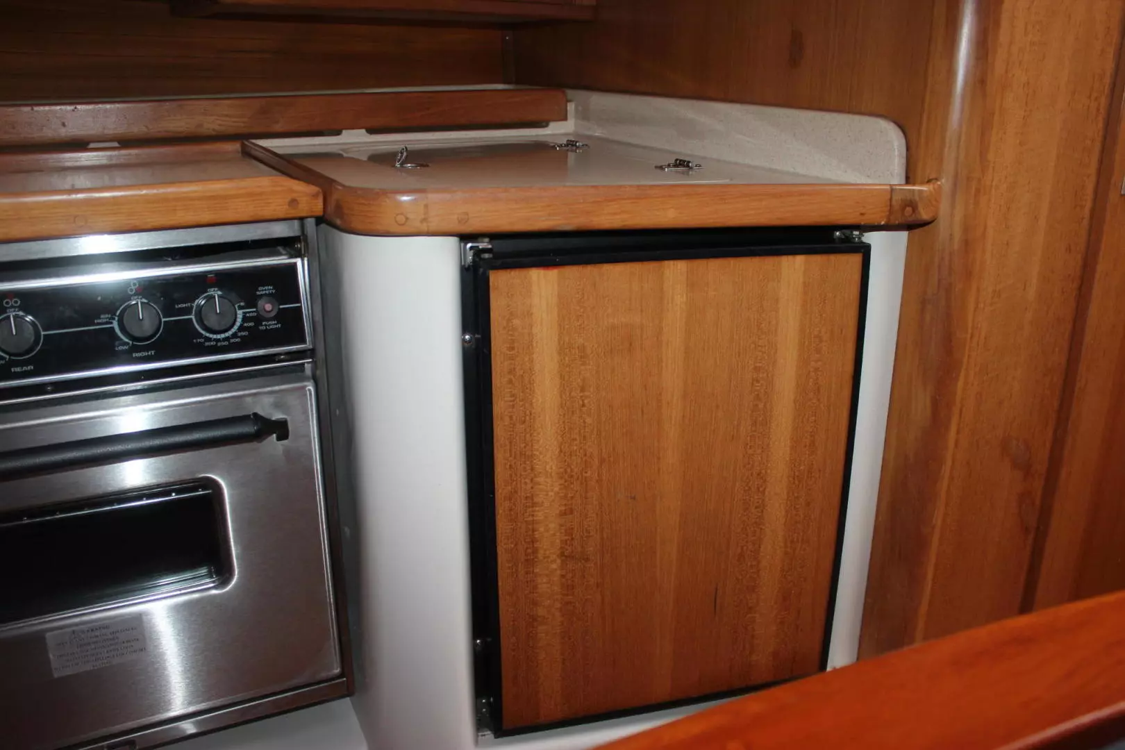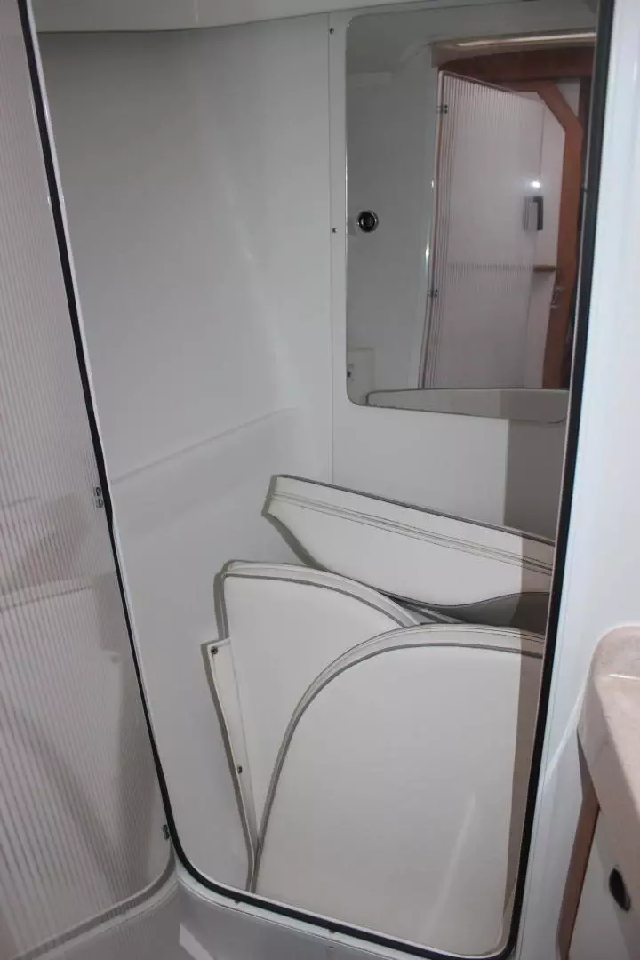 Roomy master stateroom forward has queen pullman-style berth to port with innerspring mattress. There are 2 extra large drawers beneath berth, cedar-lined hanging locker & drawers to starboard, 2 reading lights, en-suite head with opening overhead hatch & large shower stall forward.