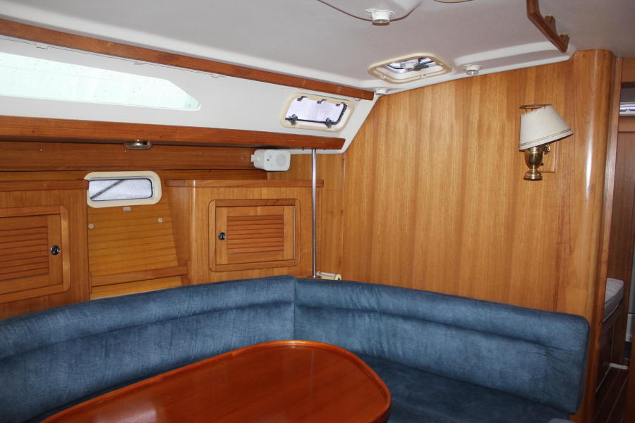 Large salon has central seating for 6. Teak shelves & cabinets outboard, varnished teak dining table flanked by a sizable settee with storage below adjoining the port chart table; walk-through galley to starboard.