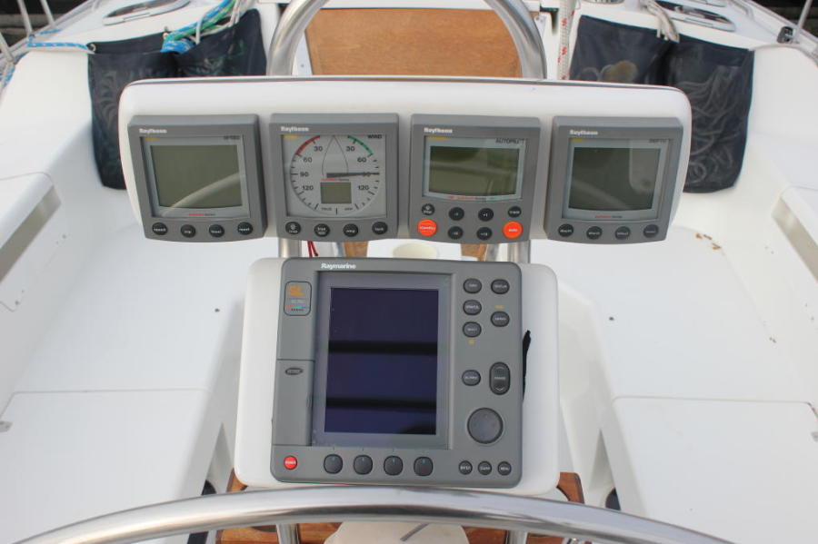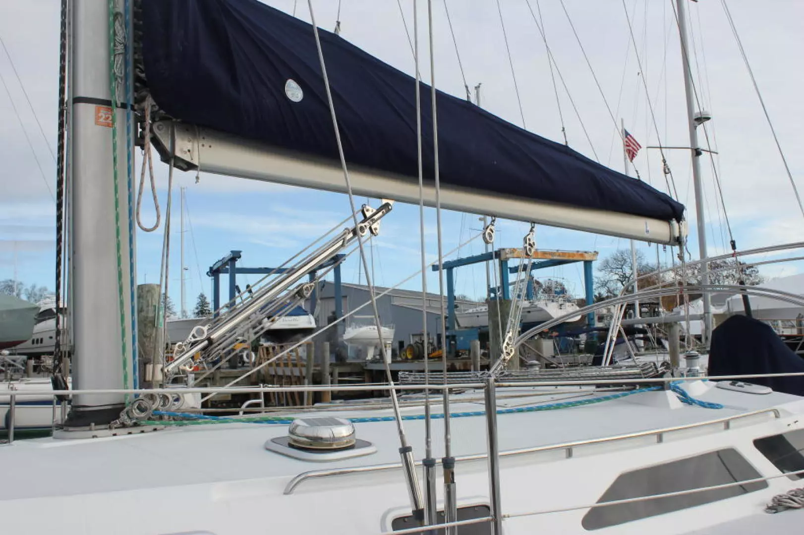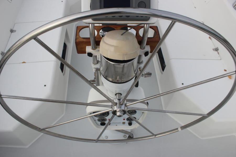 Sail control lines lead to cockpit through line clutches & self-tailing winches