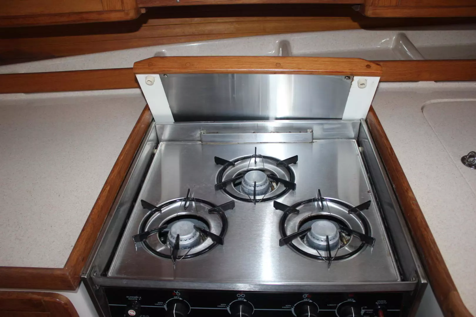 Princess 3-burner gimballed propane stove with oven, removable cover, port and starboard propane tanks in lazarette lockers