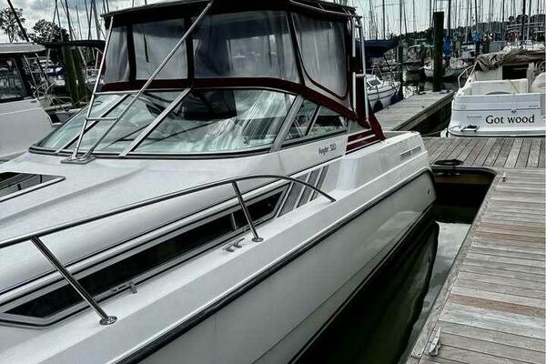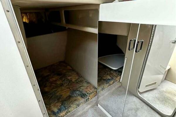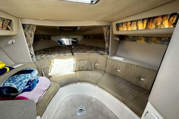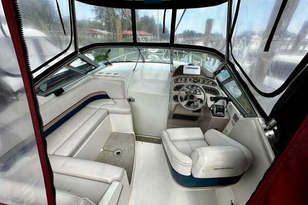 Dorisea is a well-maintained 1999 Chaparral Signature 29. These express cruisers are known for their aesthetic appeal, comfortable cabins, and excellent performance. Dorisea has unique Chaparral badging of “Angler 320” and has rod holders incorporated into the cockpit arch. There is a large swim platform that’s ideal for fishing and launching your paddleboards or kayaks. The cockpit area has a comfortable settee to port and a full canvas enclosure. A voluminous cabin below features a v-berth (sleeps two), a large dinette with wraparound seating, aft cabin, and a galley complete with a refrigerator, sink, stove, and microwave. The Signature 29 has a beam of 9 feet 9 inches, making this well-appointed cabin feel quite spacious. There is an enclosed head with a shower, and while connected to shore power, you will enjoy the comfort of the reverse cycle air conditioning.