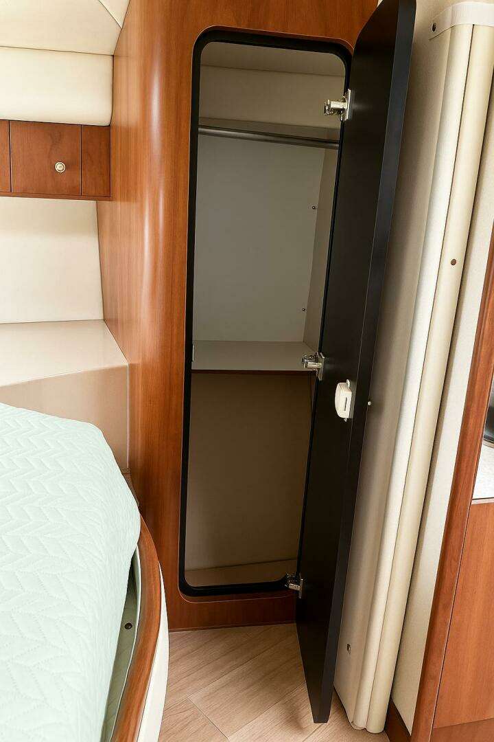 - Forward stateroom with island queen berth, privacy door, and ample storage