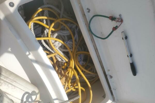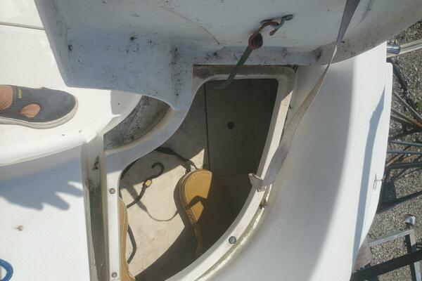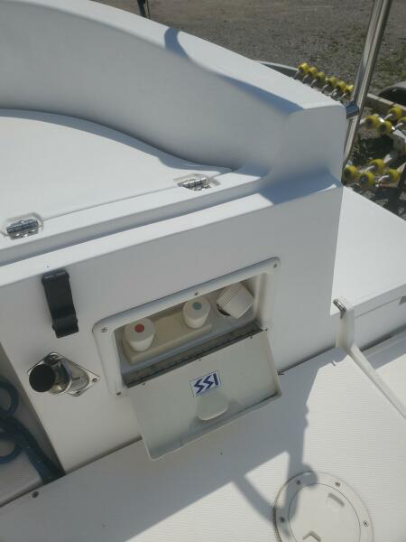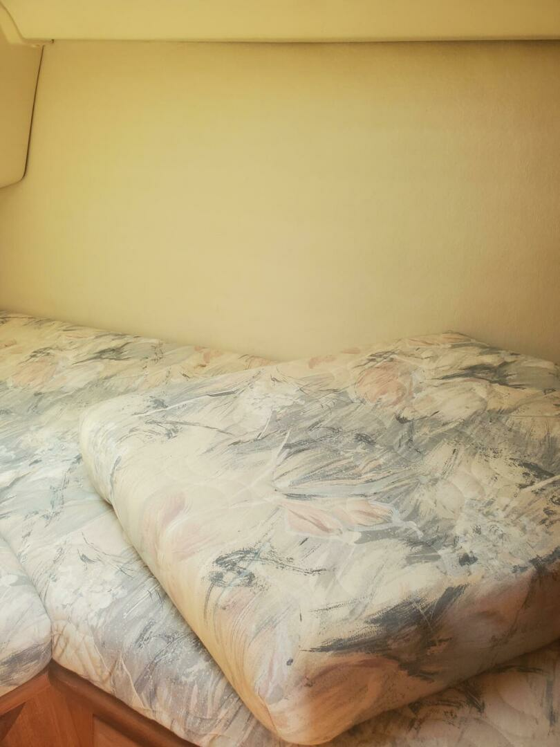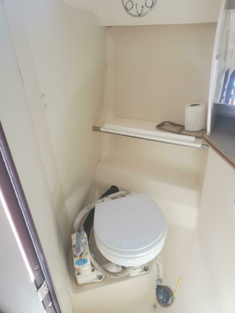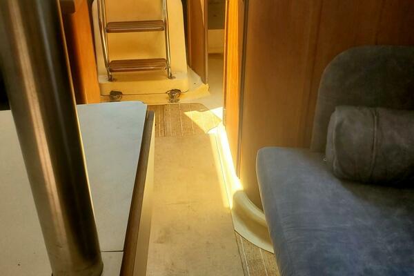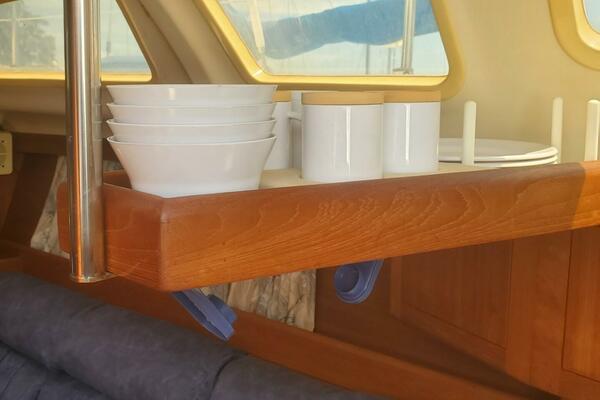 The boat is very comfortable above deck with a circular cockpit and molded table/steering pedestal.