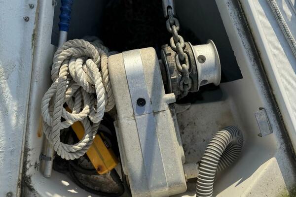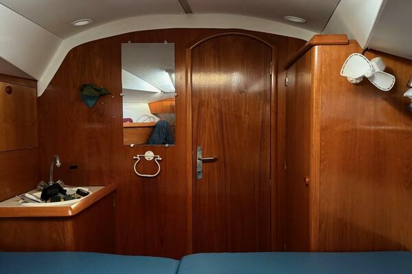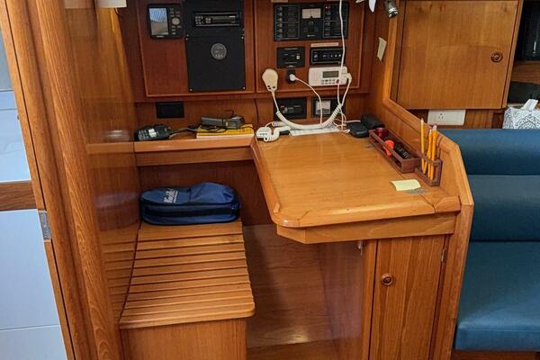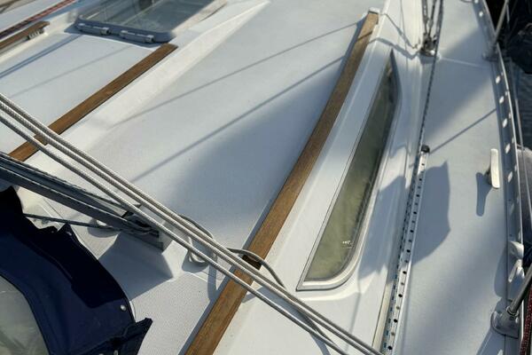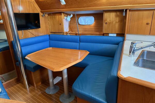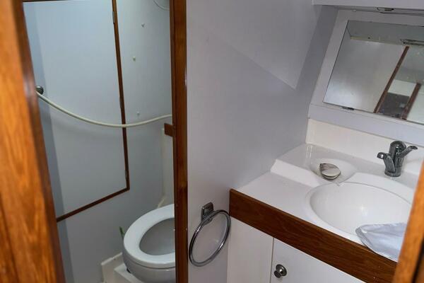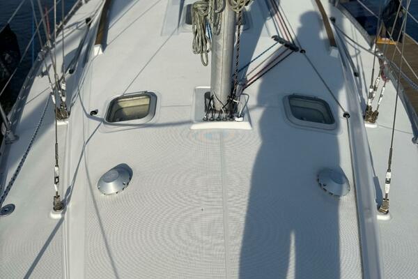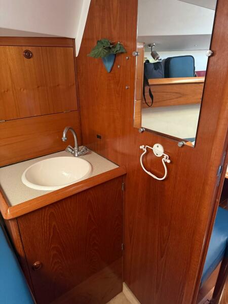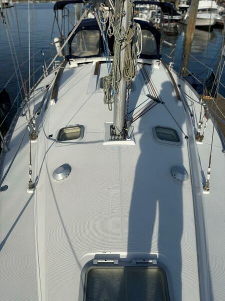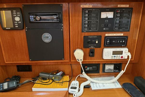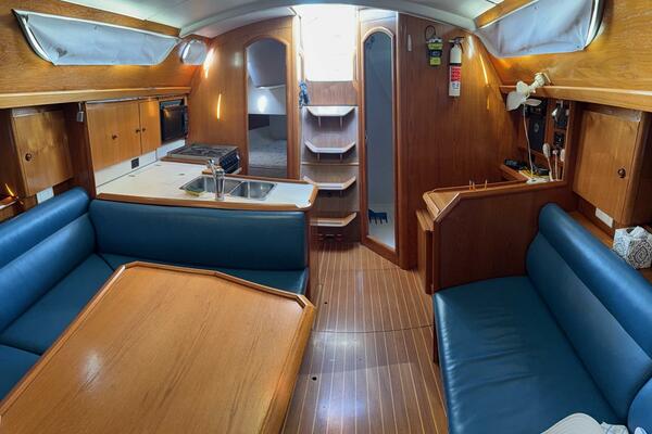 Forward stateroom with V-berth, vanity sink hanging locker and storage lockers. The salon has a dinette to starboard side and a settee opposite to port. Further aft to port is the nav station and further aft is the head compartment with electric toilet, vanity and shower. Opposite to starboard is the L-shaped galley. Further aft to starboard is the master stateroom with a queen sized berth with custom mattress. The interior has a nice wood cabinetry, a teak & holly sole, four overhead hatches and 5 opening ports. LED lights in main cabin. Fans installed in main cabin, V-berth and aft stateroom.