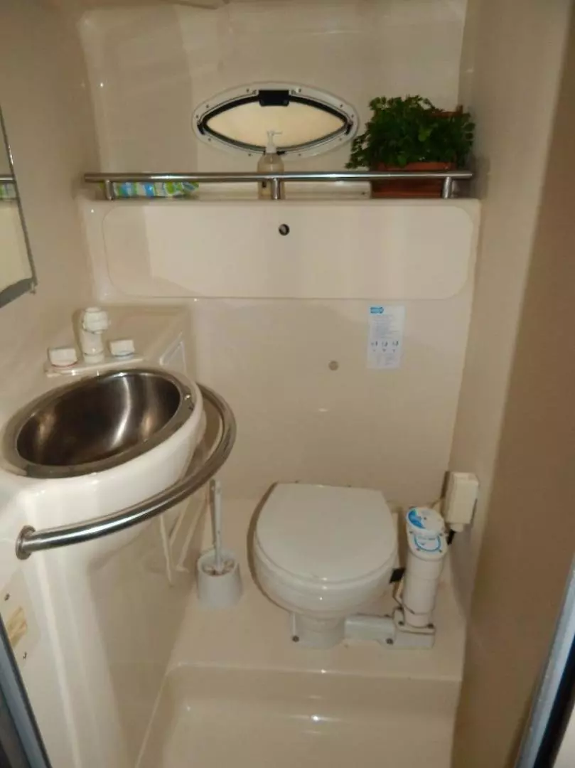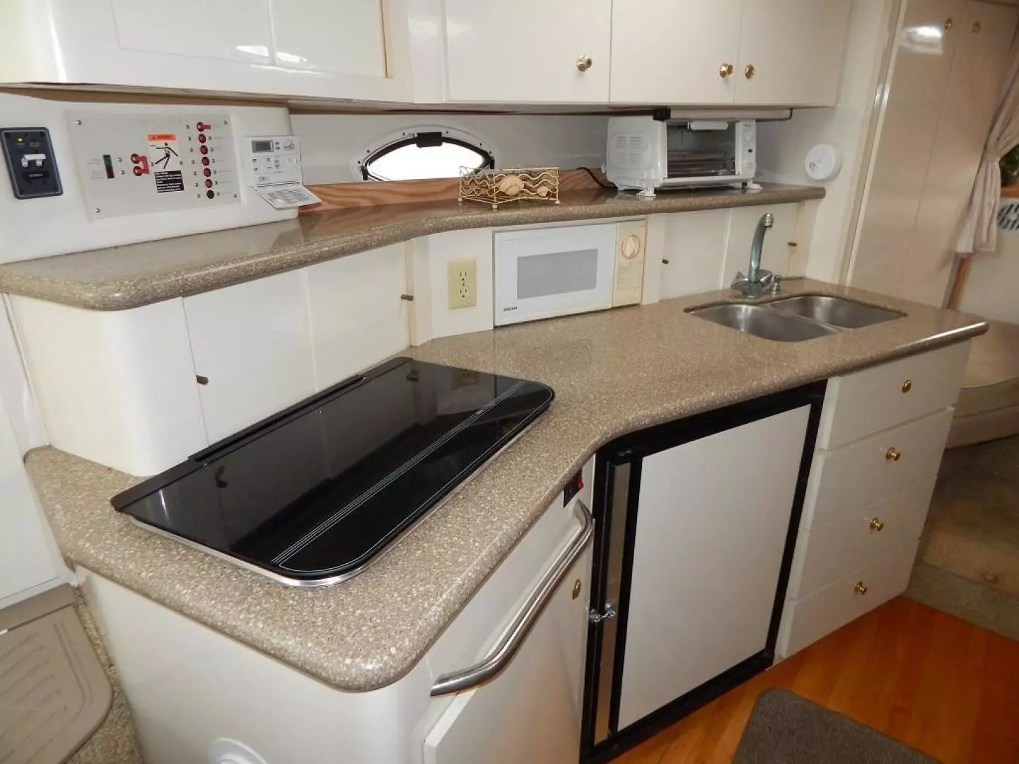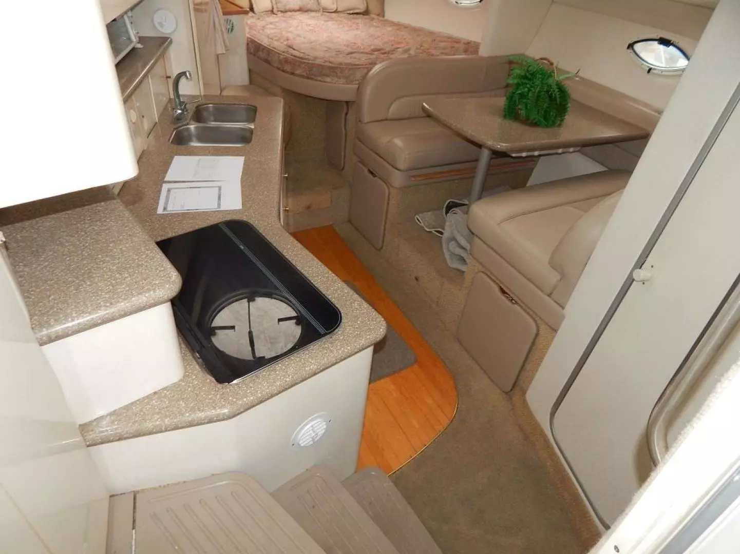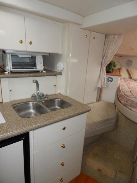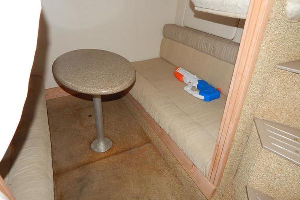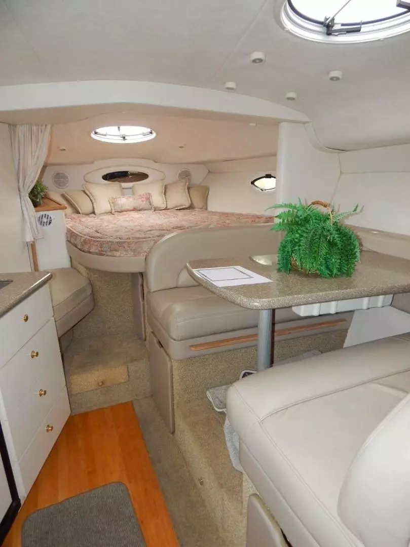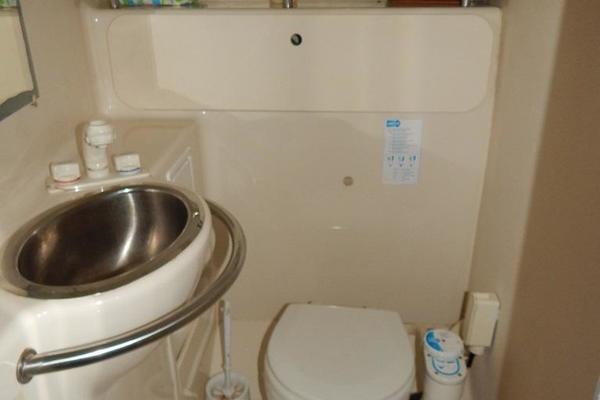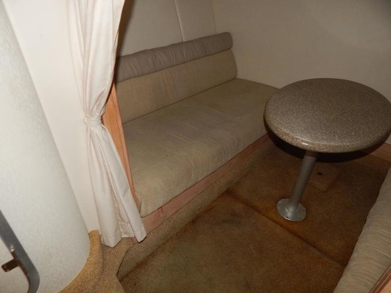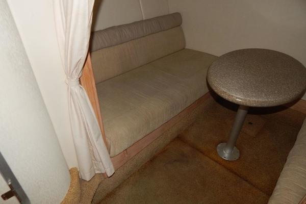 Starting forward there is a large berth offset to starboard with hanging lockers, dressing seat and storage, Next aft is the galley to port and the convertible dinette to starboard with storage under the seats. Next aft is the enclosed head to starboard and the mid cabin with 2 convertible settees is furthest aft.