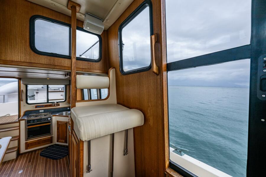 With fresh upholstery the Nordic Tug Pilothouse is hard to beat. Light and airy, this is a wonderful space to pilot to your next destination or you can open both port and starboard side doors and enjoy your morning coffee with a commanding view.