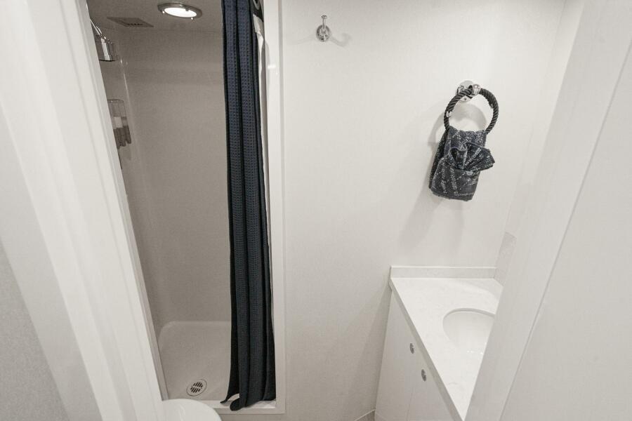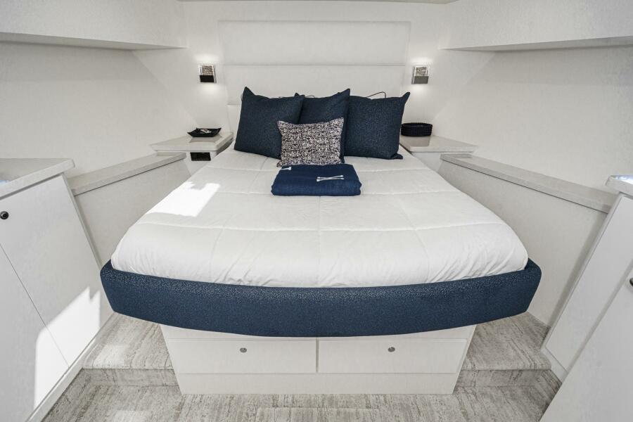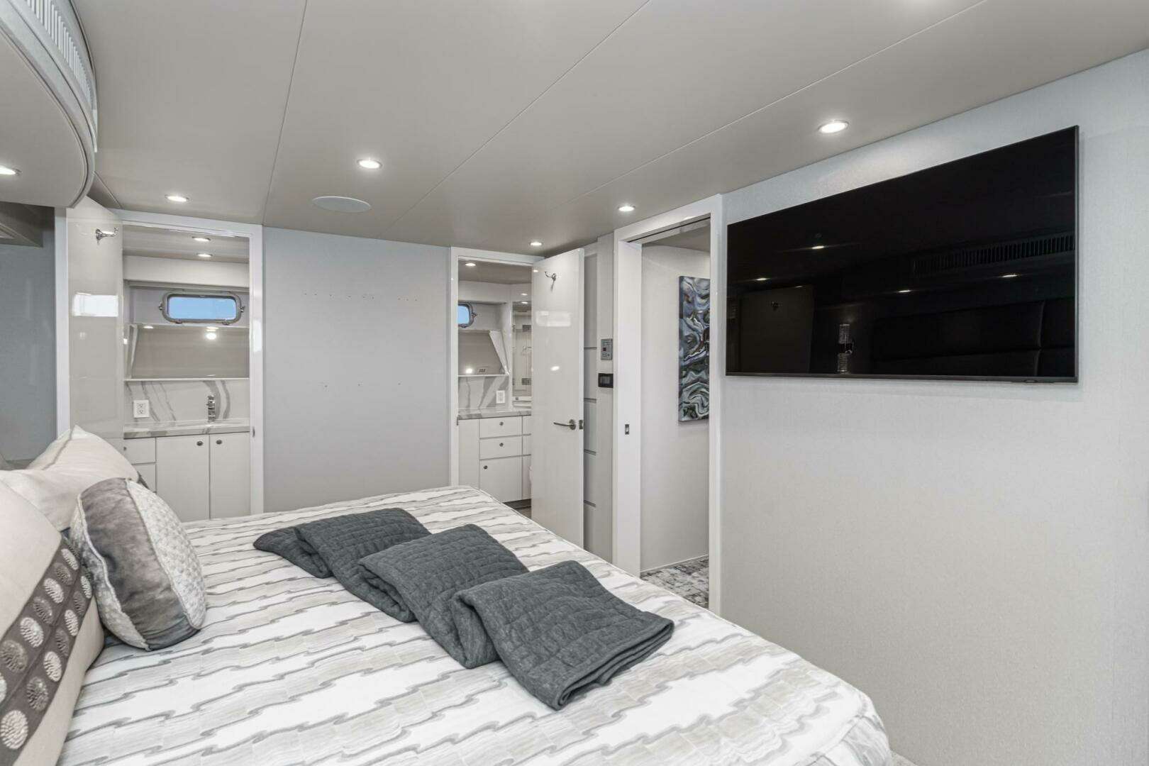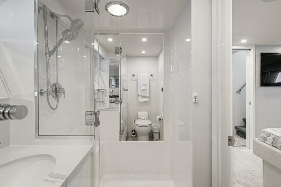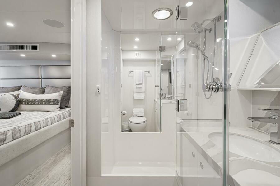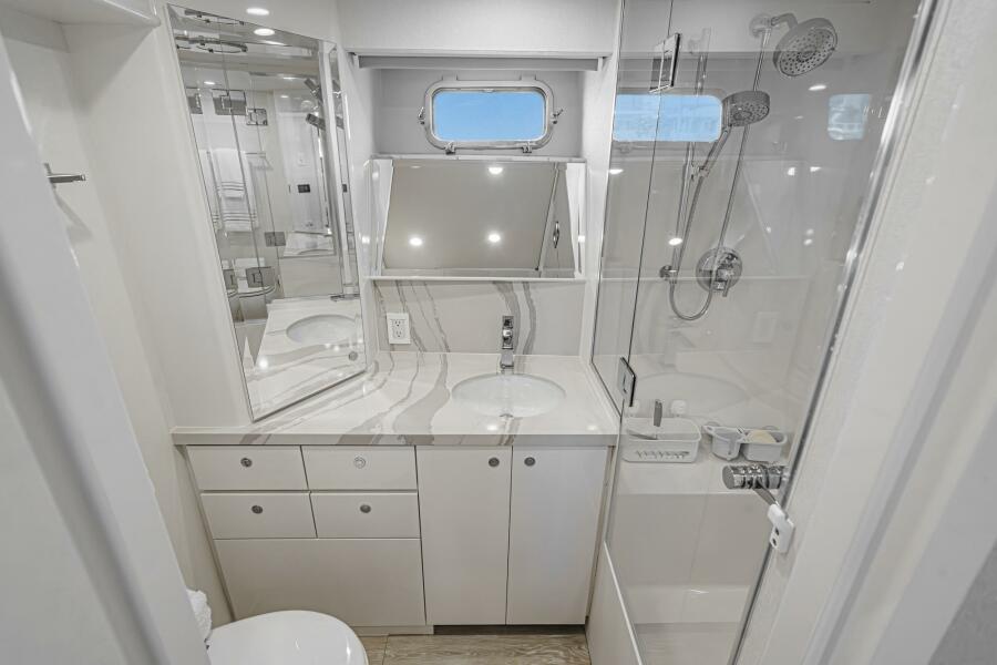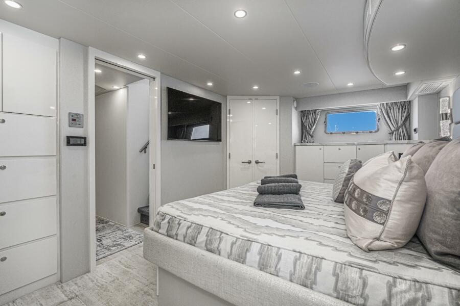 Below deck you have the owner's foyer. Mid ship aft is the master cabin with centerline king berth and ensuite his and hers heads with adjoining shared shower in between and more than ample closets and drawer storage. Moving forward in the foyer on the starboard side, you have one guest cabin with a double berth and ensuite head/shower. To port is the second guest cabin with upper and lower berths with ensuite head and shower. Moving forward is the third (VIP) Guest stateroom with centerline queen berth and ensuite head and shower. Large storage under VIP stateroom.