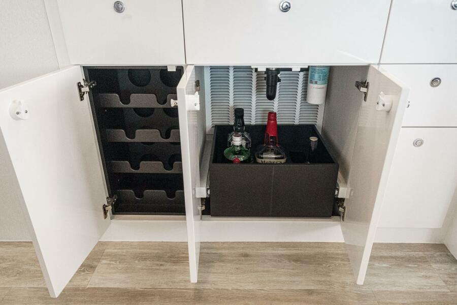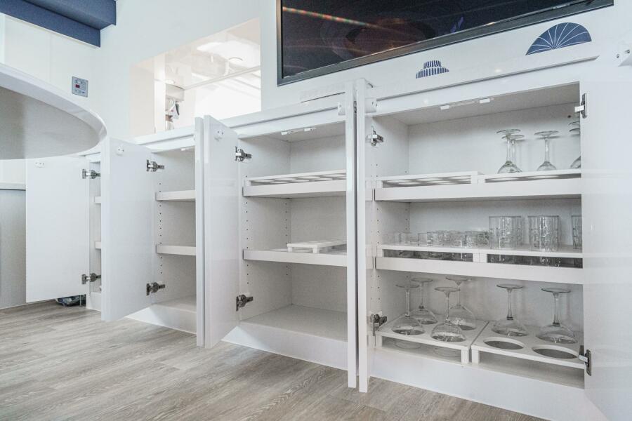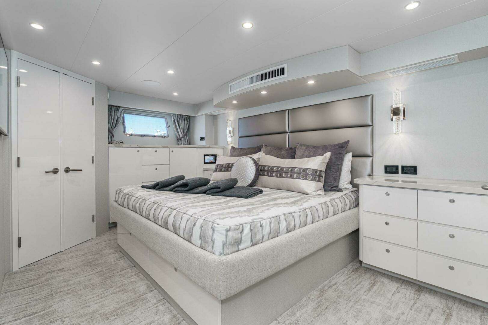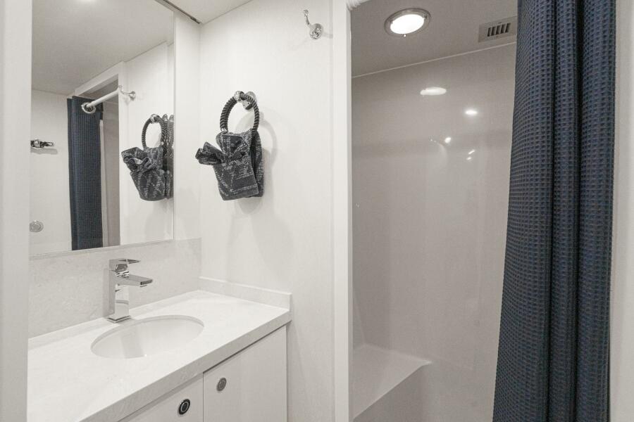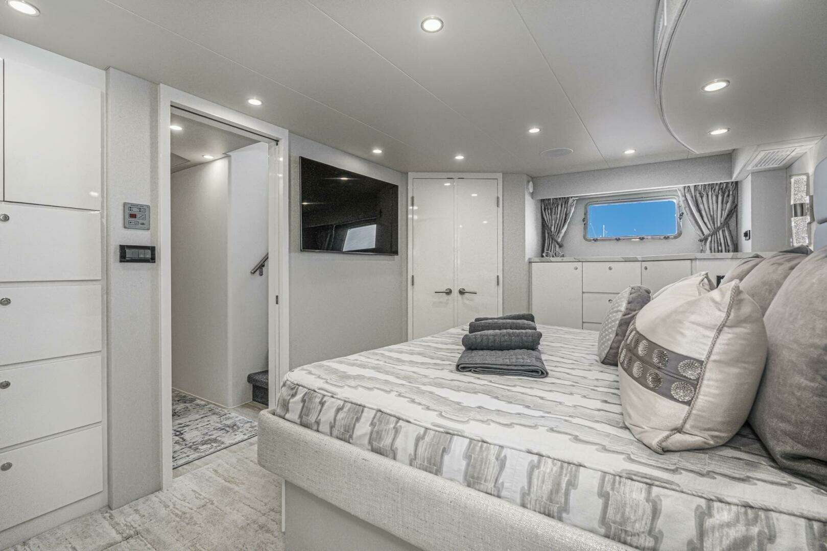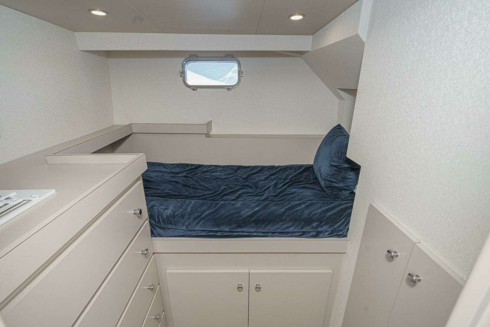 Below deck you have the owner's foyer. Mid ship aft is the master cabin with centerline king berth and ensuite his and hers heads with adjoining shared shower in between and more than ample closets and drawer storage. Moving forward in the foyer on the starboard side, you have one guest cabin with a double berth and ensuite head/shower. To port is the second guest cabin with upper and lower berths with ensuite head and shower. Moving forward is the third (VIP) Guest stateroom with centerline queen berth and ensuite head and shower. Large storage under VIP stateroom.