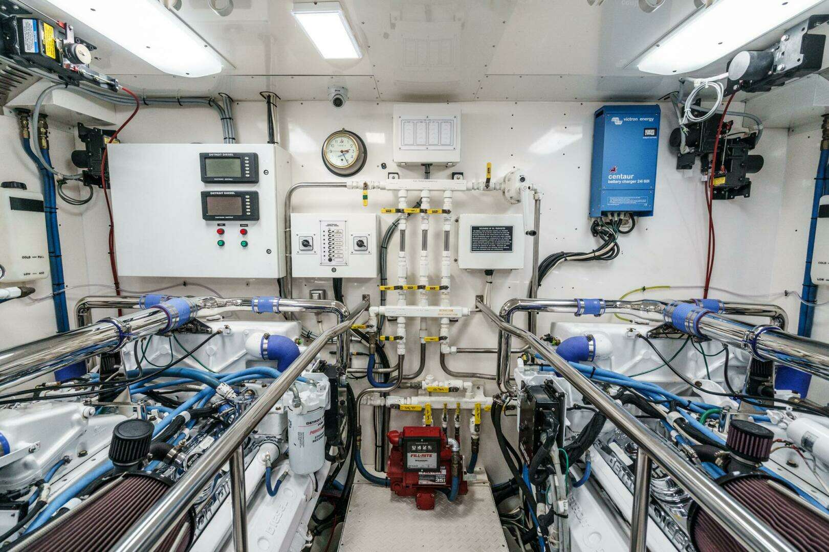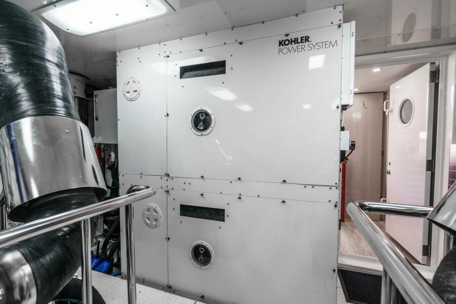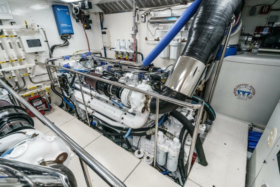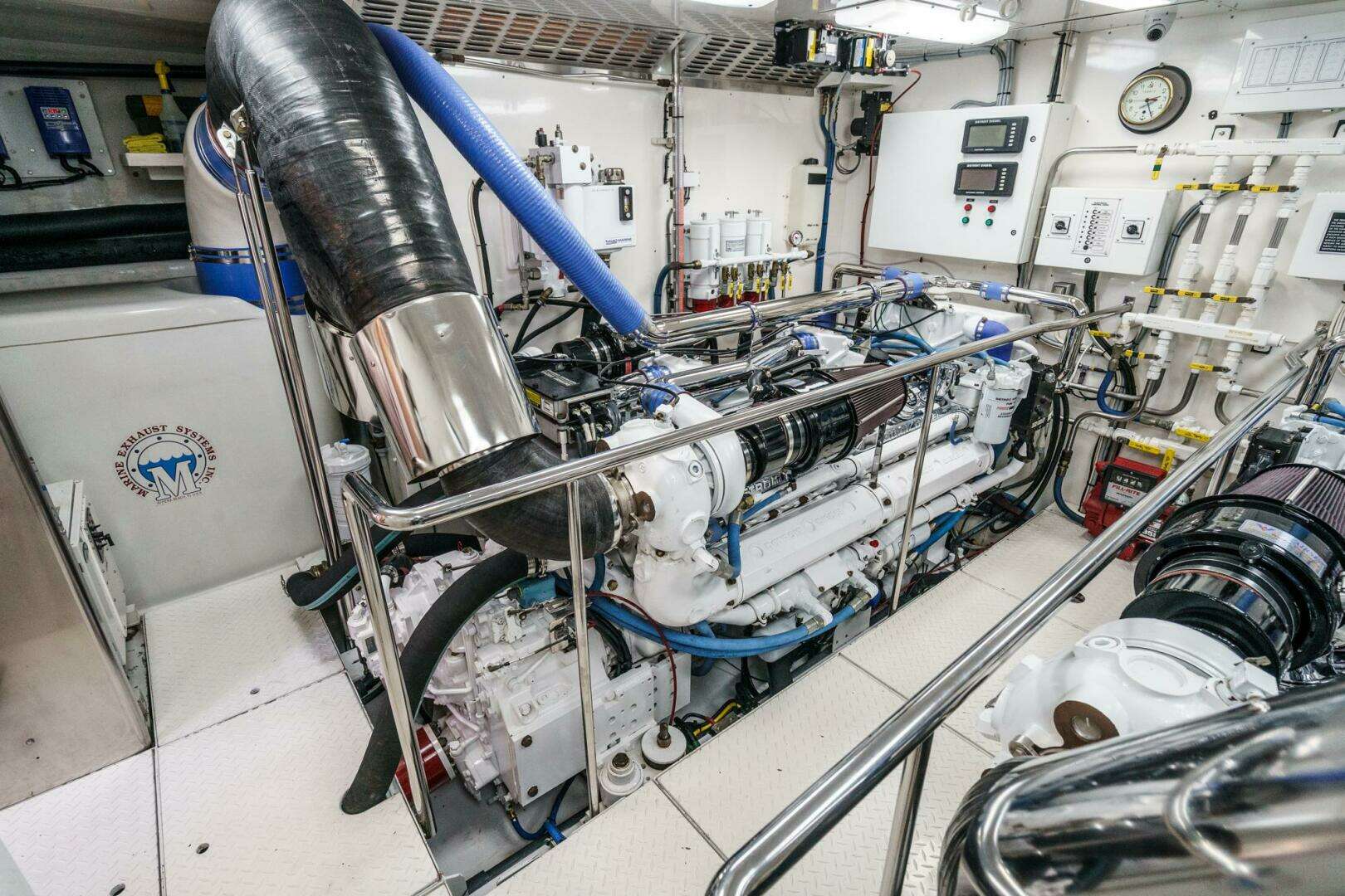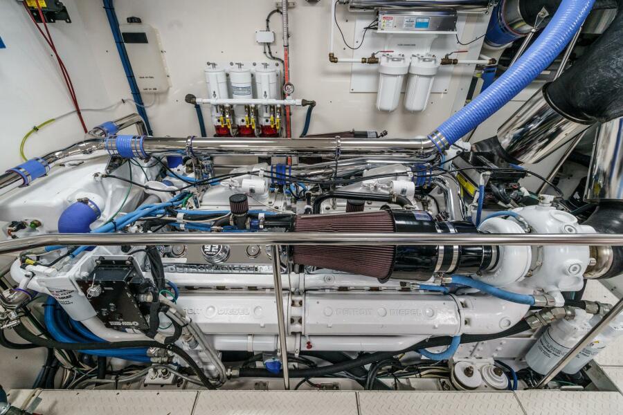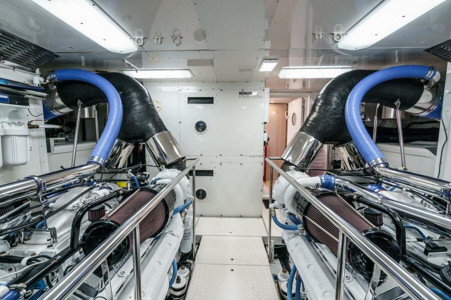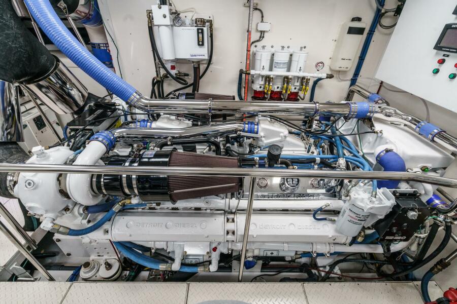 This vessel is powered by a pair of Detroit Diesel 16V-92 TAB DDEC diesel inboard engines each producing 1450 horsepower at 2300 RPM. The main engines are driving ZF BW 195A reduction gear transmissions each turning a ratio of 2.4:1. The main engines and two Kohler gensets are located in the engine room accessed via companionway through the utility room from the cockpit. The engine room is very clean, organized and well laid out.