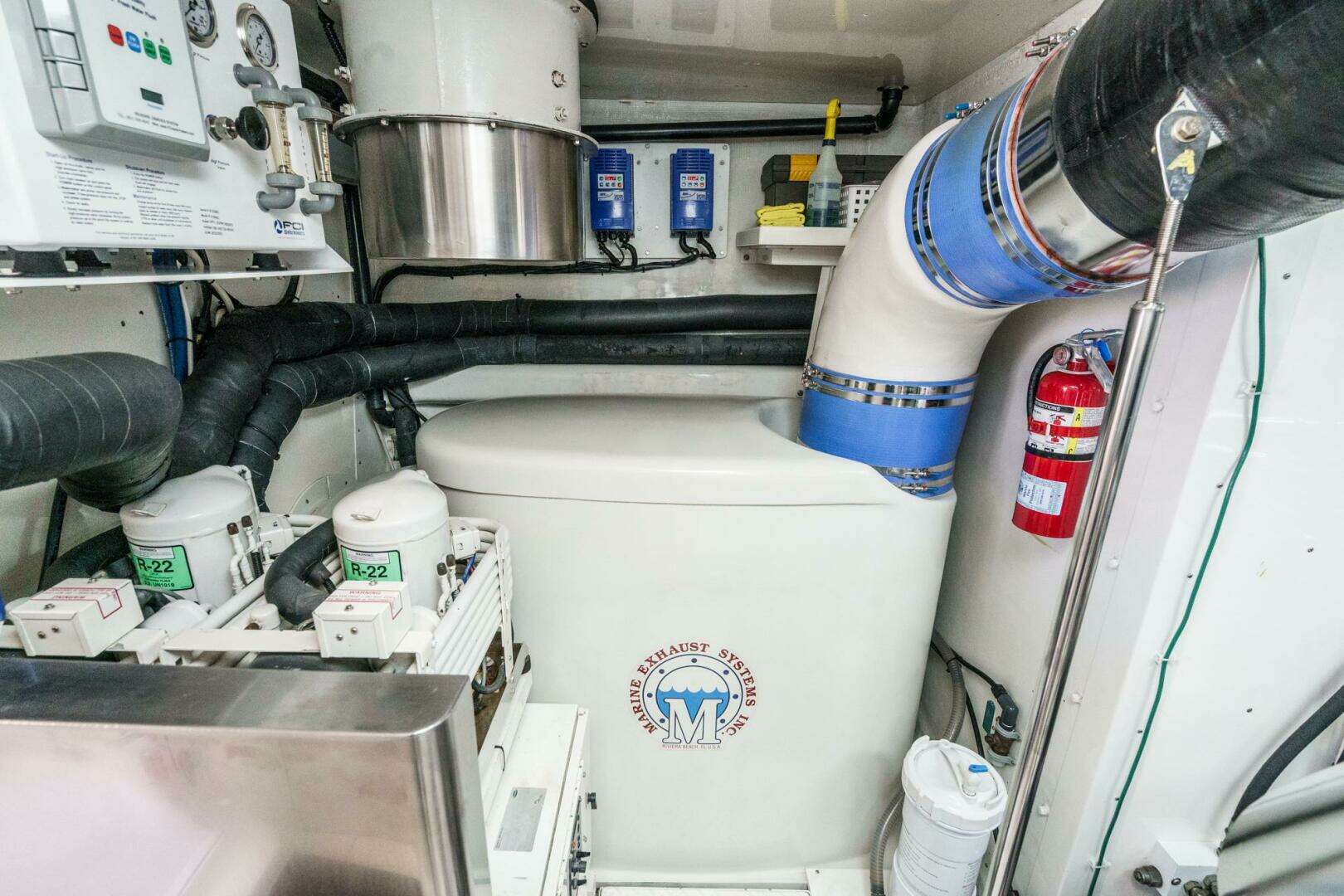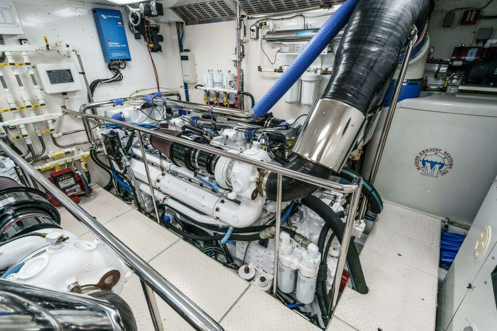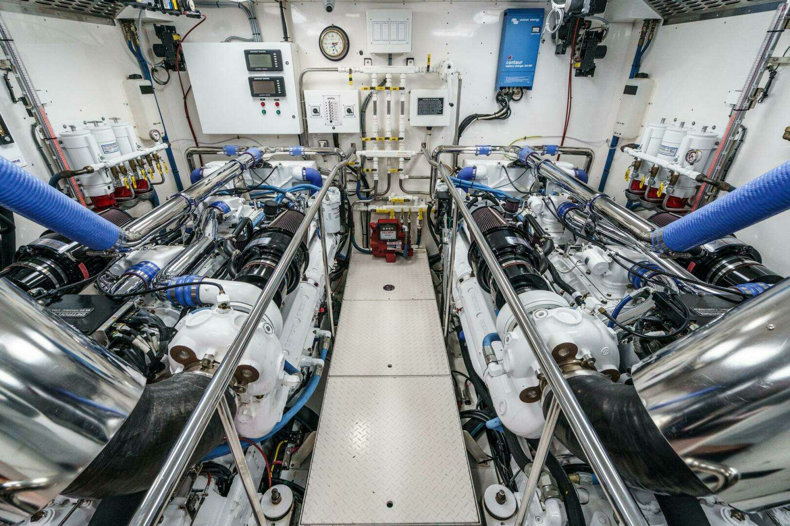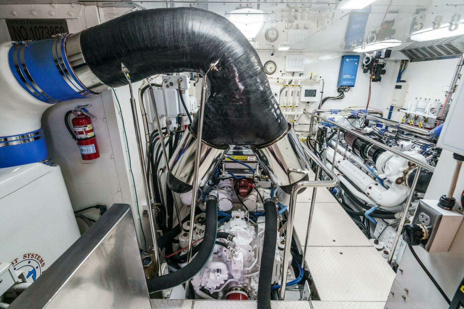 This vessel is powered by a pair of Detroit Diesel 16V-92 TAB DDEC diesel inboard engines each producing 1450 horsepower at 2300 RPM. The main engines are driving ZF BW 195A reduction gear transmissions each turning a ratio of 2.4:1. The main engines and two Kohler gensets are located in the engine room accessed via companionway through the utility room from the cockpit. The engine room is very clean, organized and well laid out.