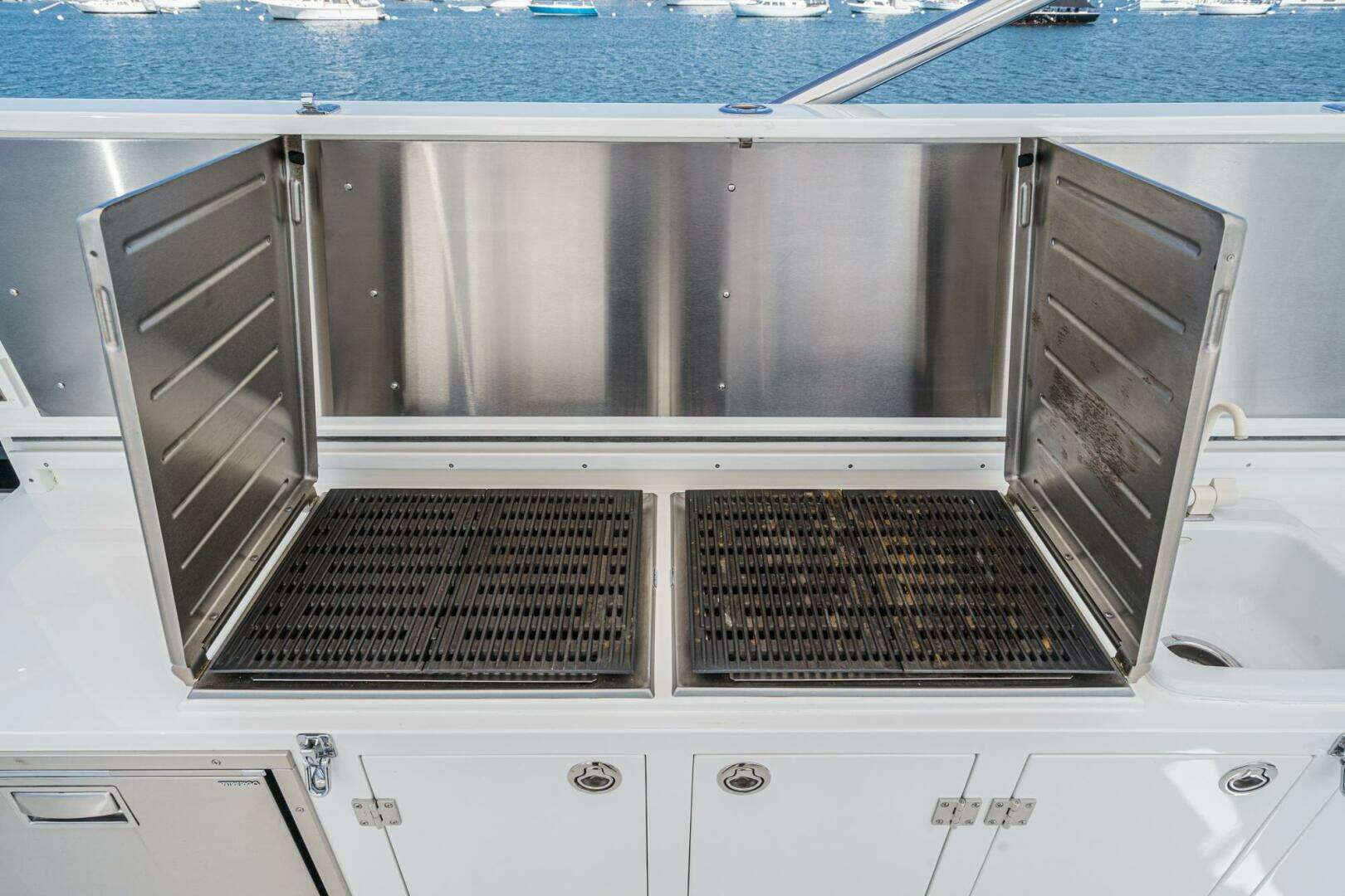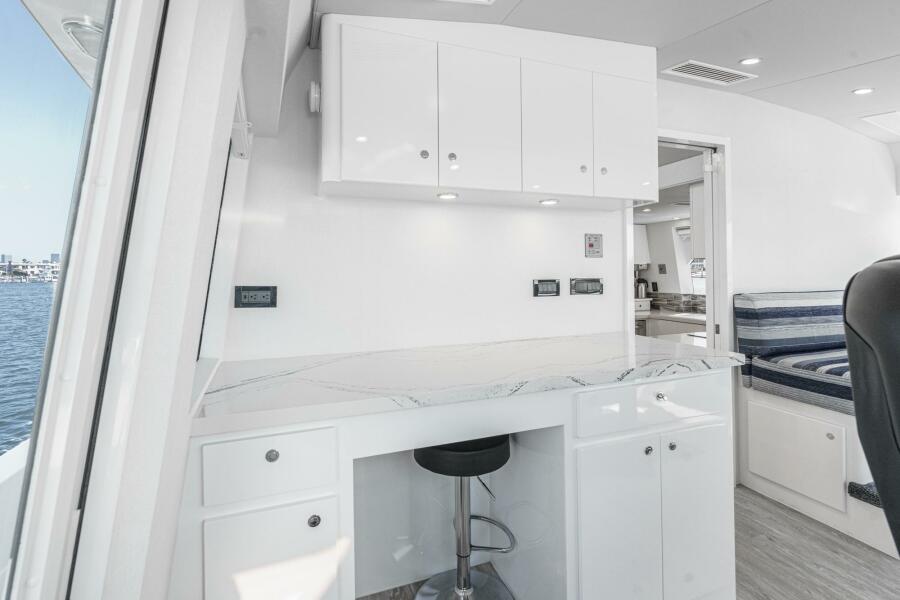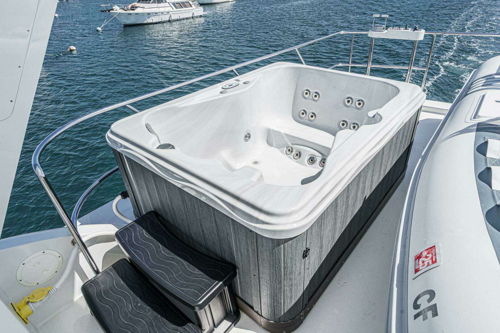 The enclosed pilothouse features two Stidd helm chairs, a full array of new electronics, raised banquet seating and table, port and starboard wing doors. Moving up to the bimini covered flybridge, you have twin helm chairs, an array of electronics, and large L-shape seating and table to port. To starboard you have twin built-in BBQ, sink and small refrigerator and additional storage. Aft on the boat deck is jacuzzi, tender, power rotating 2000-pound davit and aft helm docking station.