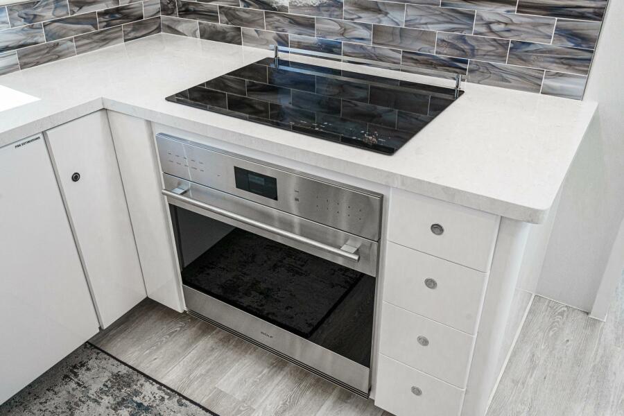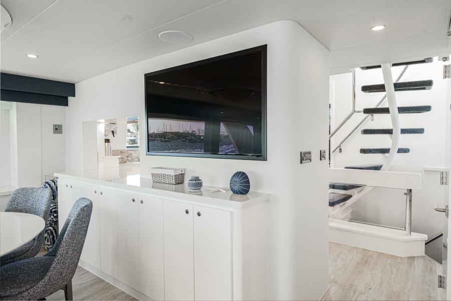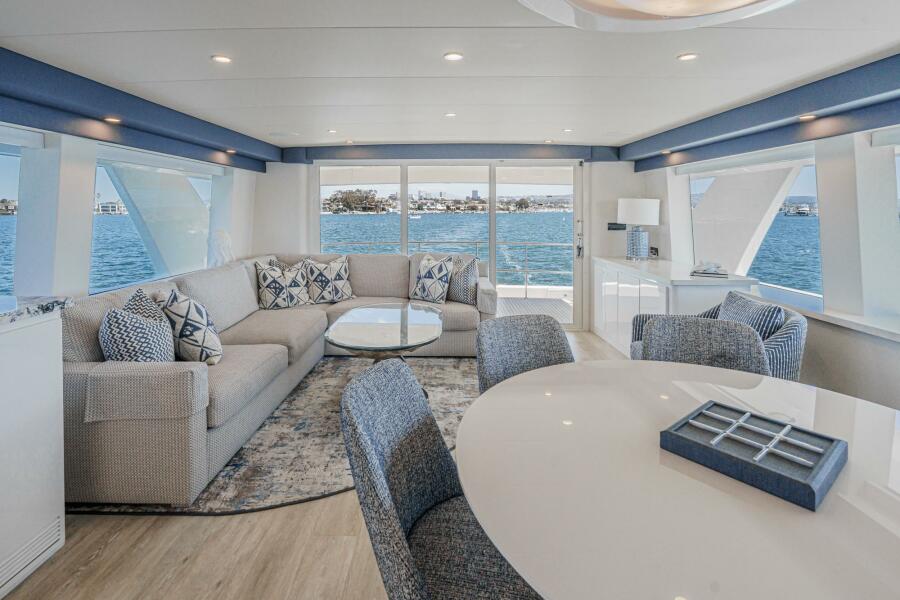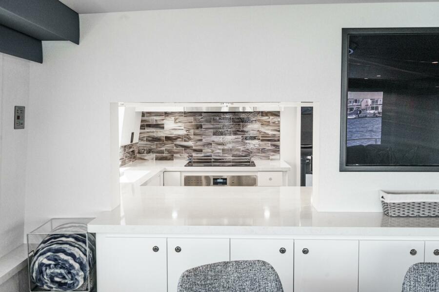 Moving up a few steps from the cockpit, you have a covered teak aft deck with settee seating facing aft, and complete walkaround side decks with port and starboard forward entrance boarding gates. You enter the light and bright airy salon via the aft deck or port and starboard wing doors via the enclosed pilot house. The salon has large viewing windows, both port, starboard, and aft. Full updated entertainment center, L-shaped sofa, wet bar, sink and bottle storage, updated lighting and forward open dining area.
