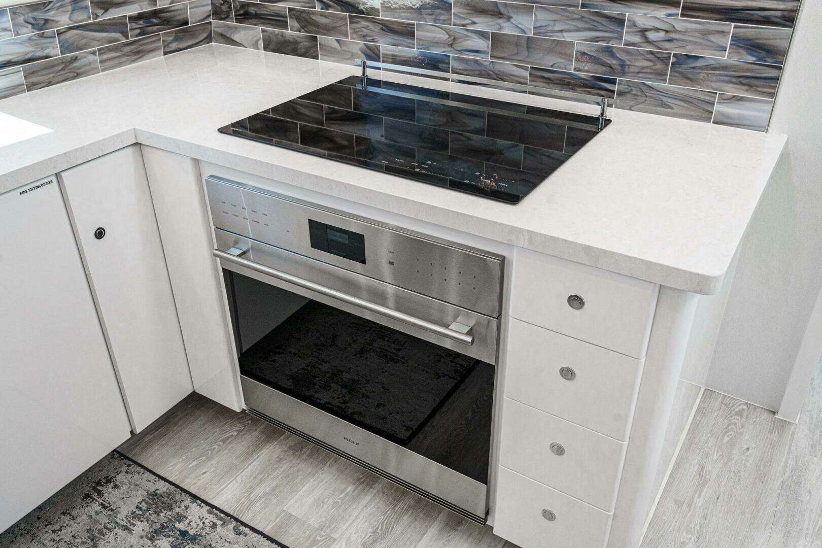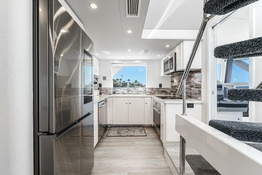Moving forward and to port is the updated galley. To starboard is the day head, a staircase leads up to the flybridge and there are stairs leading down to the owner's sleeping accommodations.