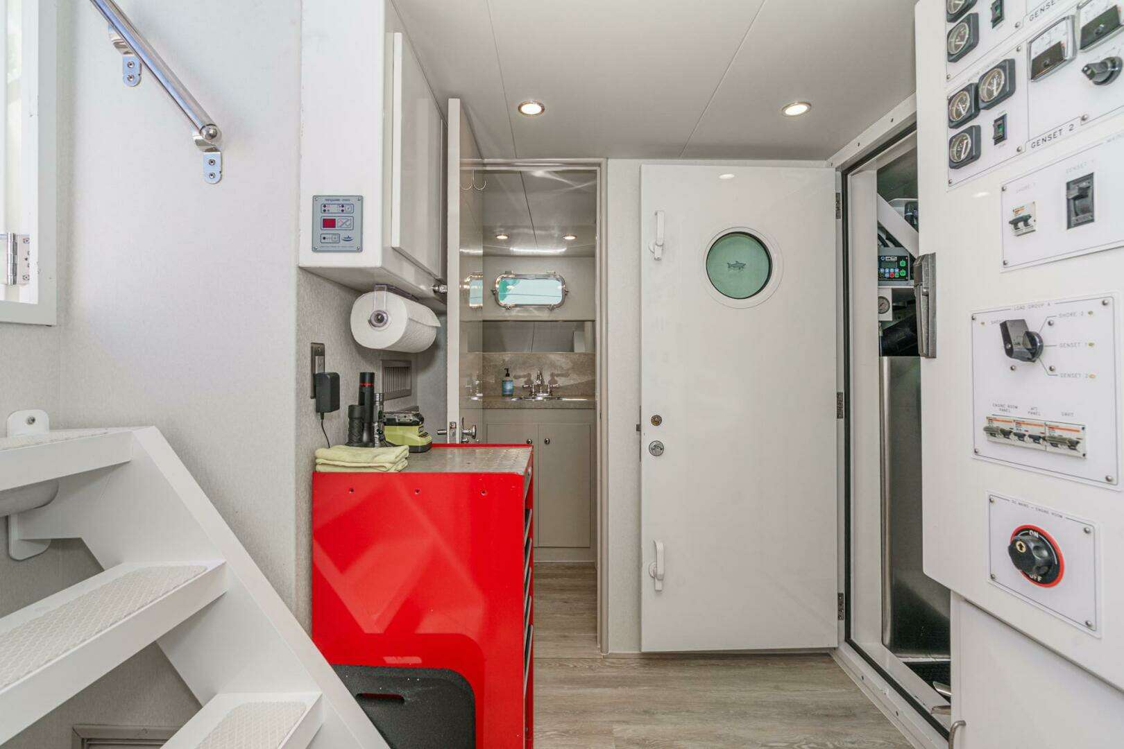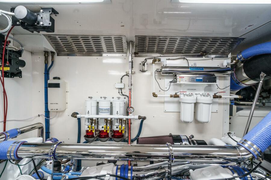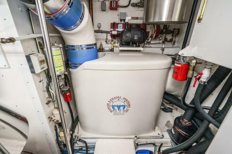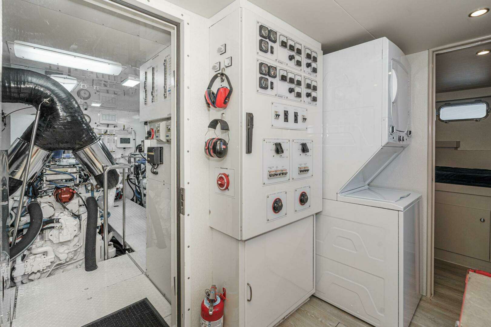 Four staterooms plus crew. Starting aft, you have excellent boarding via a large, integral teak swim step that leads into the teak cockpit. The cockpit features two large flush deck lockers for storage, two beverage refrigerators, cockpit controls, 15-gallon gasoline dispenser, and additional storage lockers. You have centerline entrance to the aft crew quarters that offers Captain's berth, enclosed head/shower, a small crew galley with microwave oven, refrigerator & freezer, washer and dryer, and workspace area. Moving forward you enter a very neat and tidy engine room.