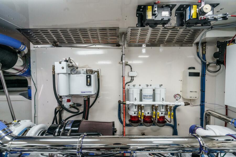 The main engines have been completely rebuilt July 2022 to include, main bearings, pistons, liners, turbos, heads, hoses, clamps etc. The main engines and transmissions look like new. 300 Hours since major overhaul! The gensets sit starboard aft in the engine room, one mounted atop the other. The fuel system consists of three aluminum tanks plumbed to the machinery via high pressure neoprene hose with inline new Racor triple primary filters along with shutoff valves, transfer system with valve manifold, electric and manual pumps. The main engines are controlled by single lever DDEC fly by wire controls from four stations with digital color display in the pilothouse on the Simrad screen.