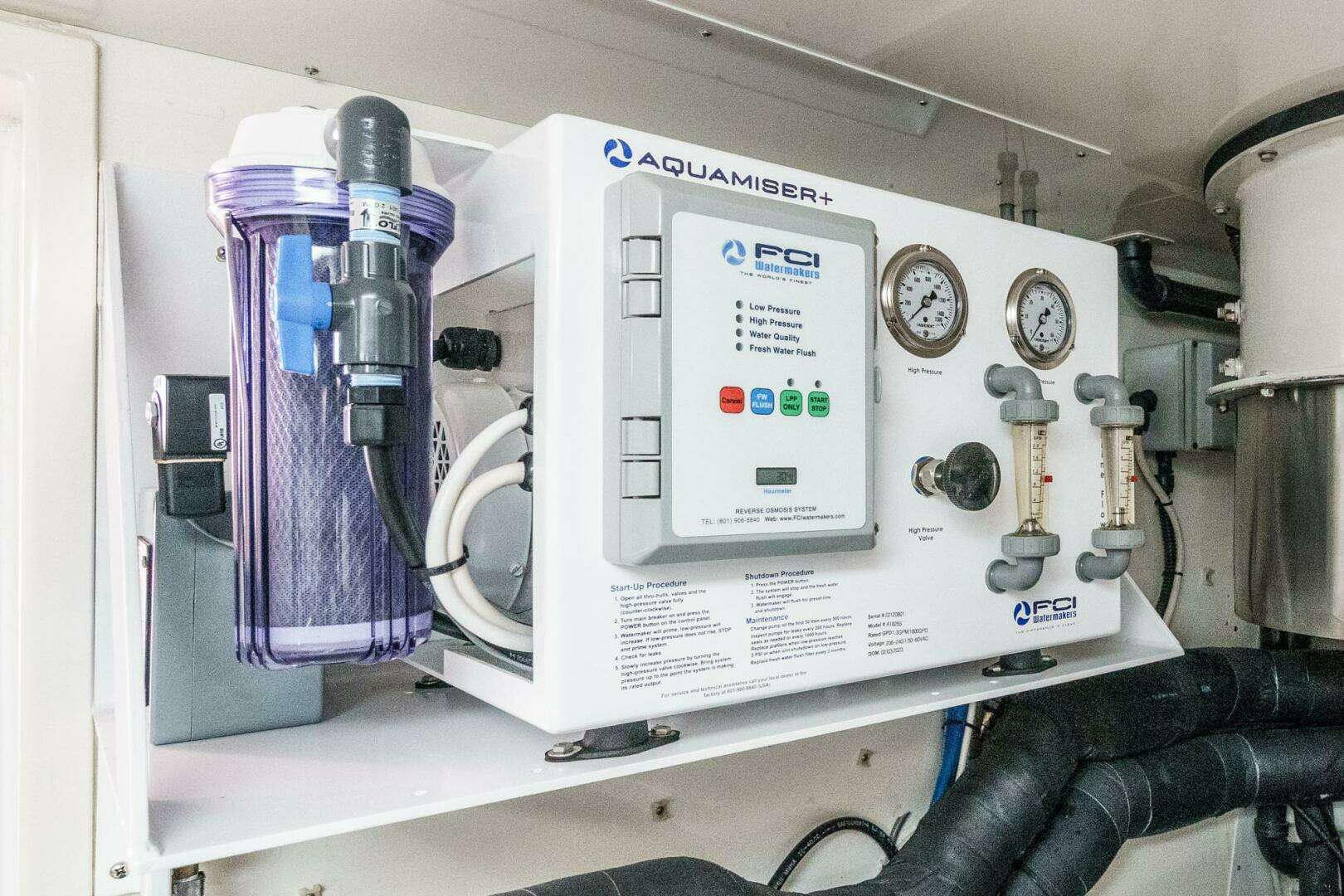 The vessels DC power is supplied by ten AGM 8D AGM batteries (new May 2023) The AC power is supplied by 50 Amp 125 / 250VAC shore power inlets, both fitted with Charles Iso Boost transformers. The AC power is also supplied by two Kohler 32 EOZ gensets. Also capable of being powered by a Victron Energy 32000 inverter/charger (new May 2023). The electrical switch and breaker panels are located in the engine room, utility room, forward companionway and pilothouse.