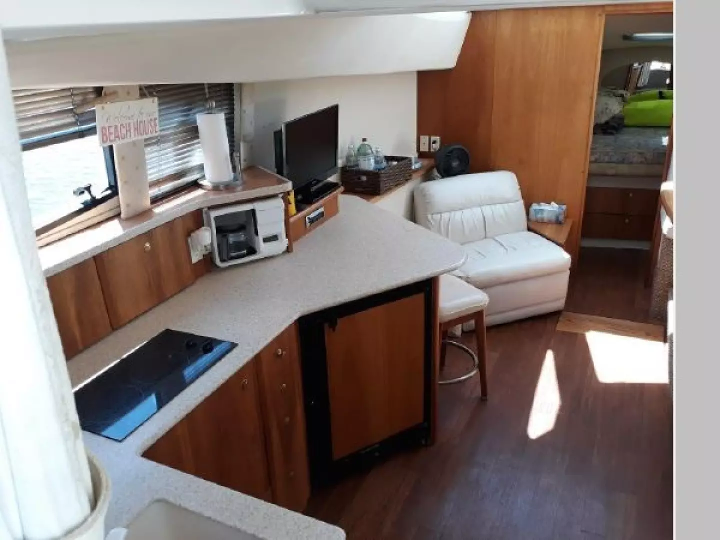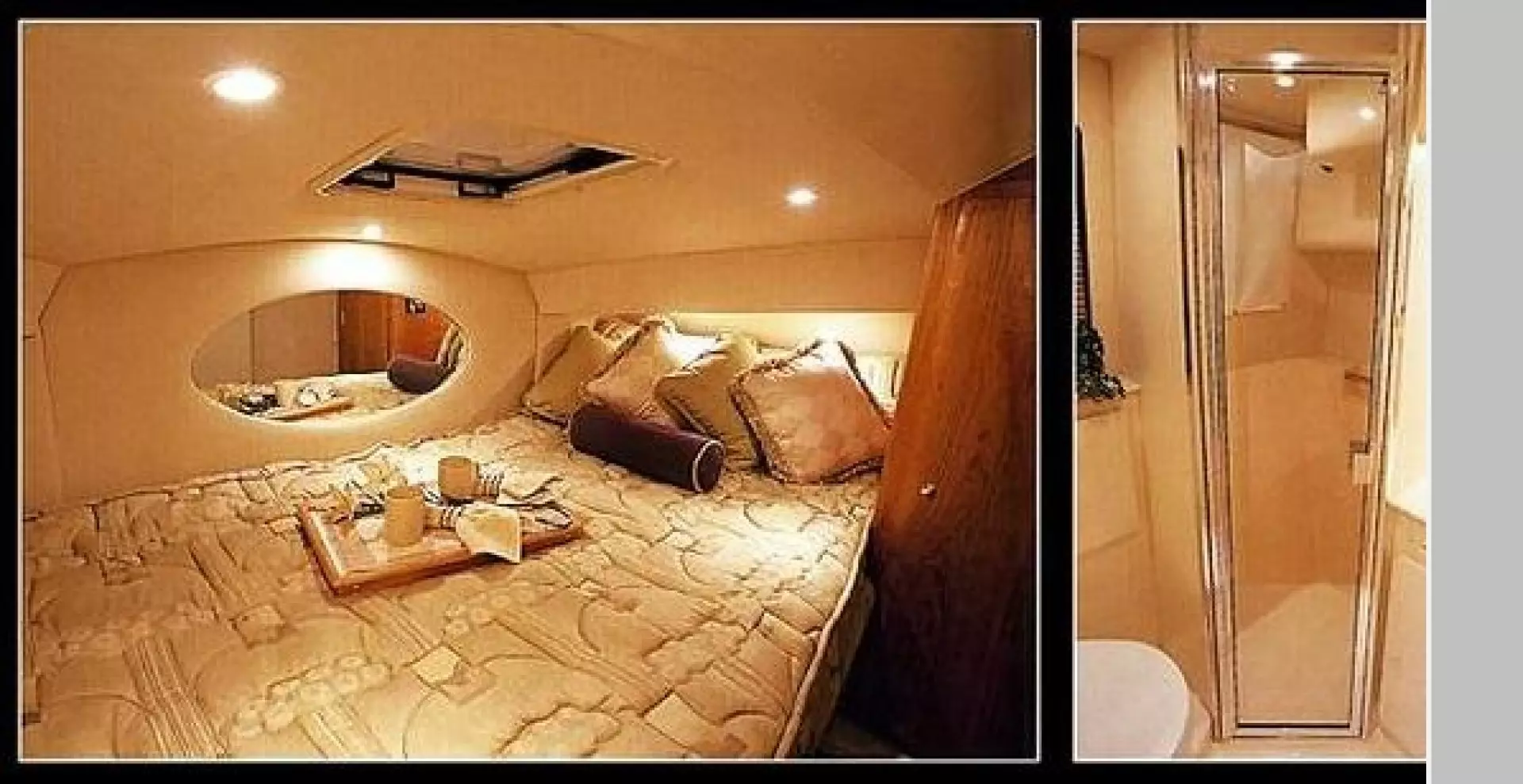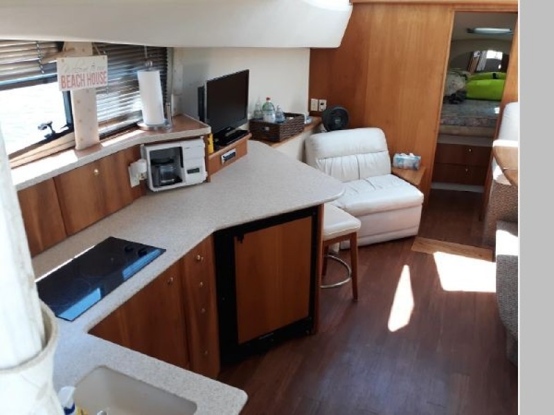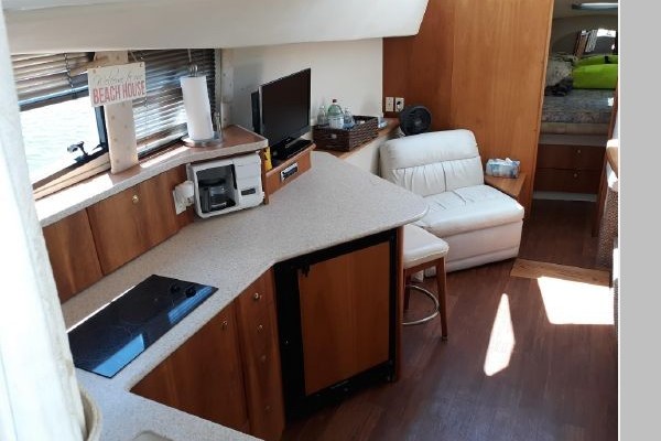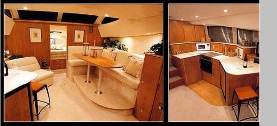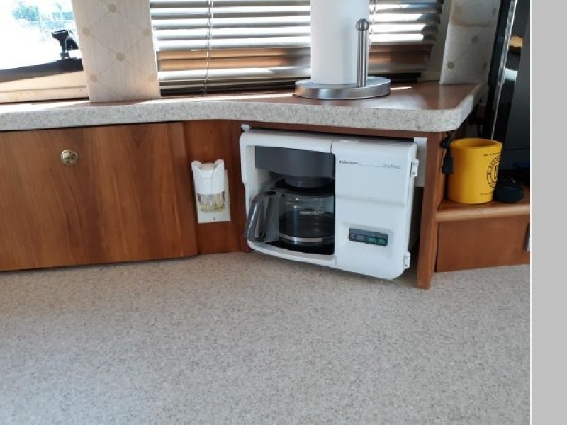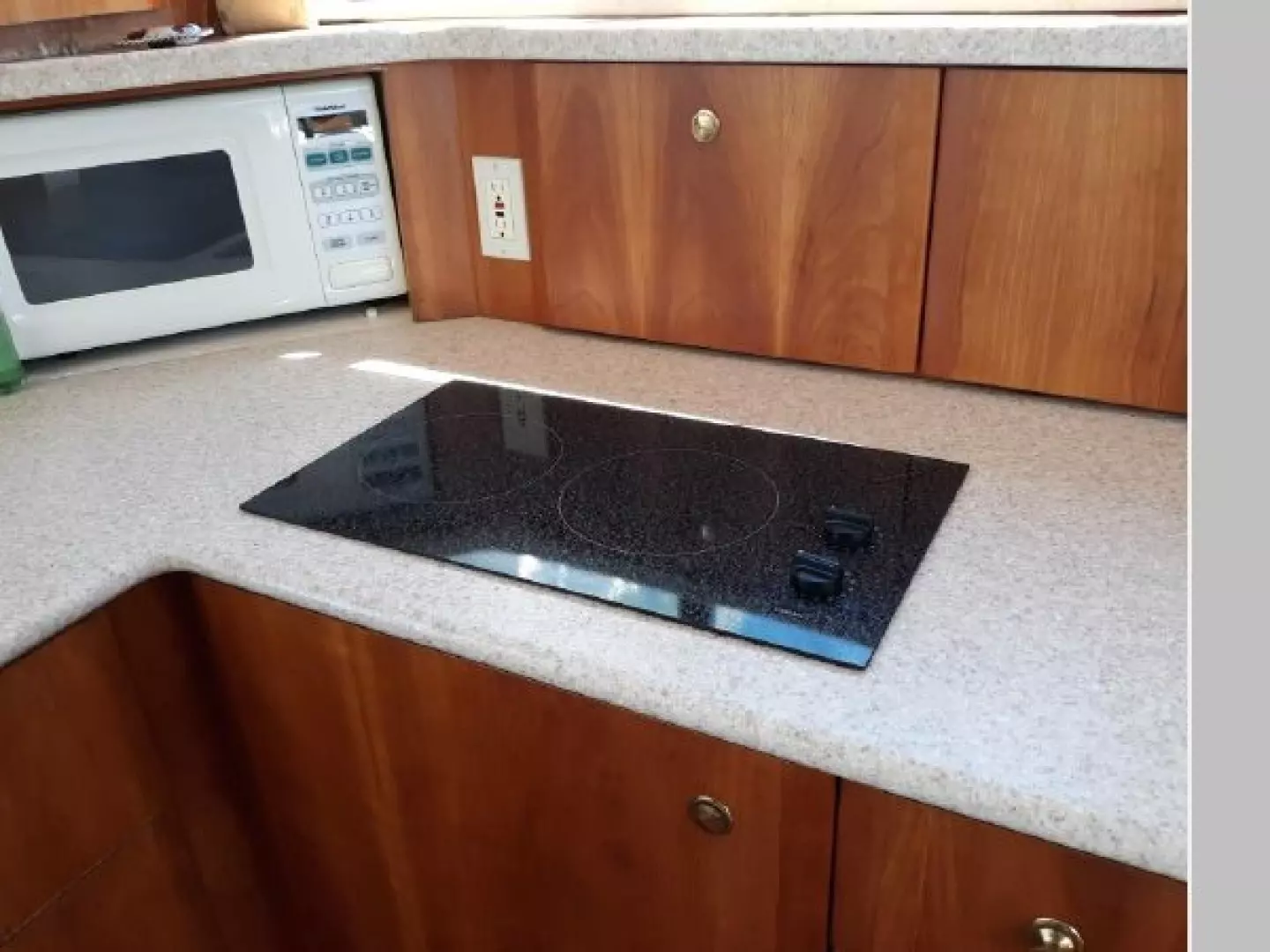 The unusually spacious, full-width interior is all on one level and can sleep 4. The salon headroom is unbelievable! Along the port-side is a huge galley with large, Corian countertops, lots of cabinets and a good-size breakfast bar with two stools. Forward, in the corner is a comfortable built-in reclining seat. On the starboard side is a roomy head compartment with vanity, sink, electric marine head and a large stall shower. Next is a large L-shape dinette with Ultra-leather cushions and a long, solid cherry table. The dinette can convert to sleep two. Further forward is the private master stateroom with a double berth (with inner-spring mattress), sliding privacy door, cedar lined hanging locker and additional storage. The air-conditioned interior is carpeted and finished in rich cherry cabinetry. Large windows on three sides provide plenty of natural light. There is an AM/FM/CD stereo system and wiring for cable TV.