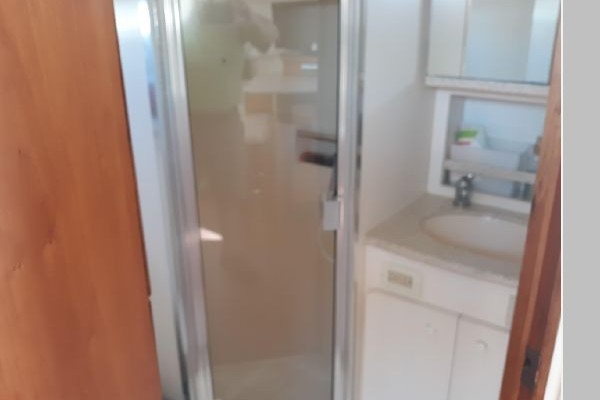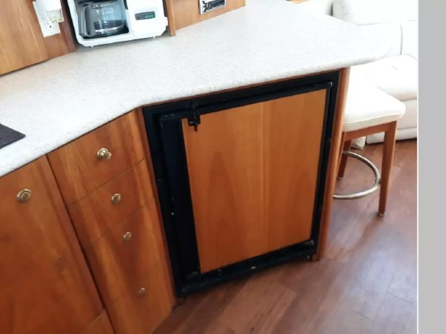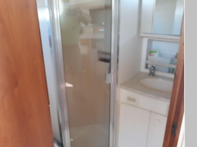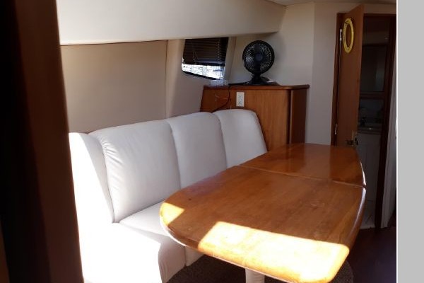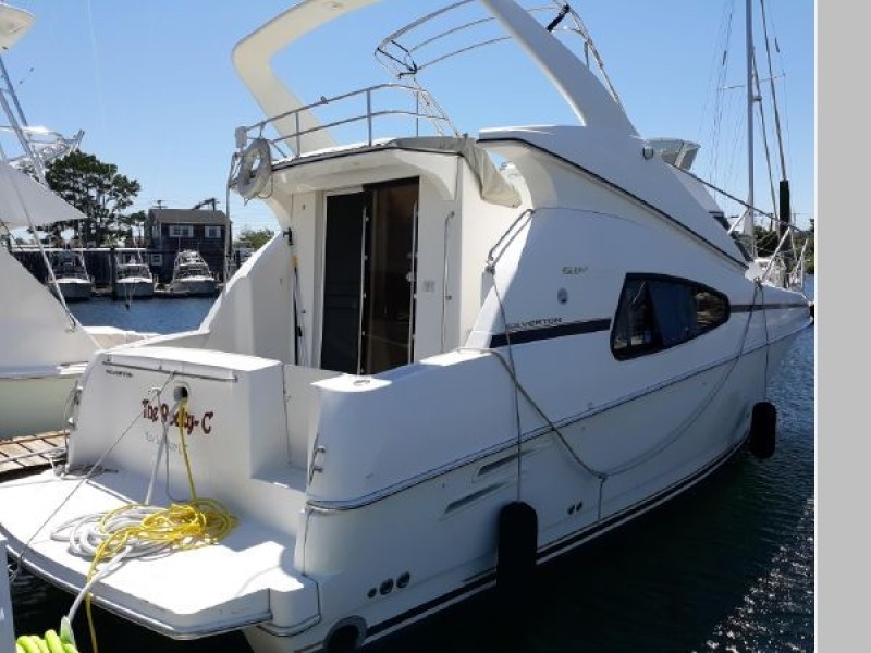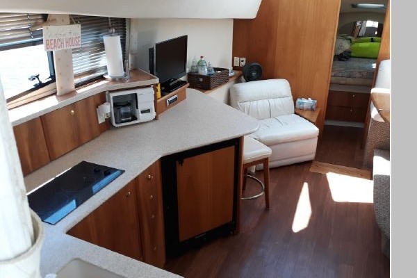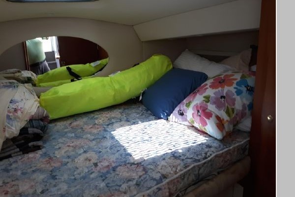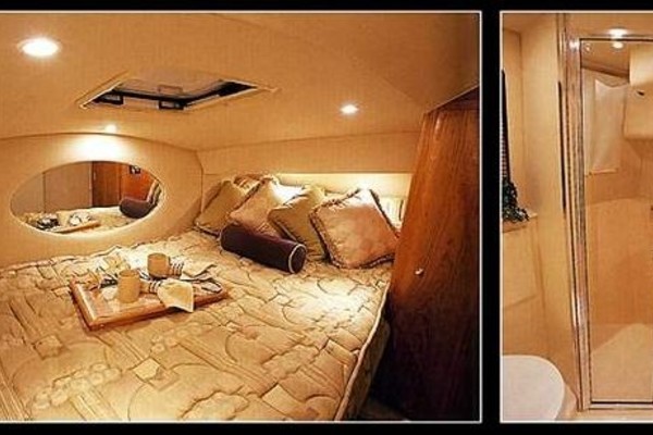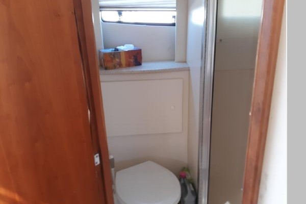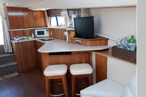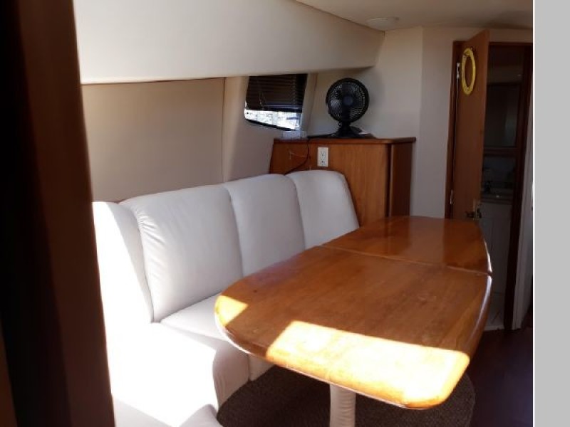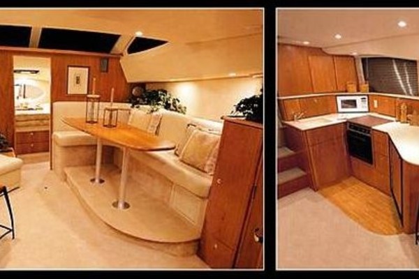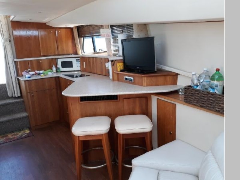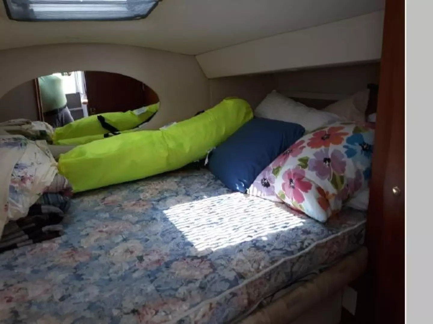 The unusually spacious, full-width interior is all on one level and can sleep 4. The salon headroom is unbelievable! Along the port-side is a huge galley with large, Corian countertops, lots of cabinets and a good-size breakfast bar with two stools. Forward, in the corner is a comfortable built-in reclining seat. On the starboard side is a roomy head compartment with vanity, sink, electric marine head and a large stall shower. Next is a large L-shape dinette with Ultra-leather cushions and a long, solid cherry table. The dinette can convert to sleep two. Further forward is the private master stateroom with a double berth (with inner-spring mattress), sliding privacy door, cedar lined hanging locker and additional storage. The air-conditioned interior is carpeted and finished in rich cherry cabinetry. Large windows on three sides provide plenty of natural light. There is an AM/FM/CD stereo system and wiring for cable TV.