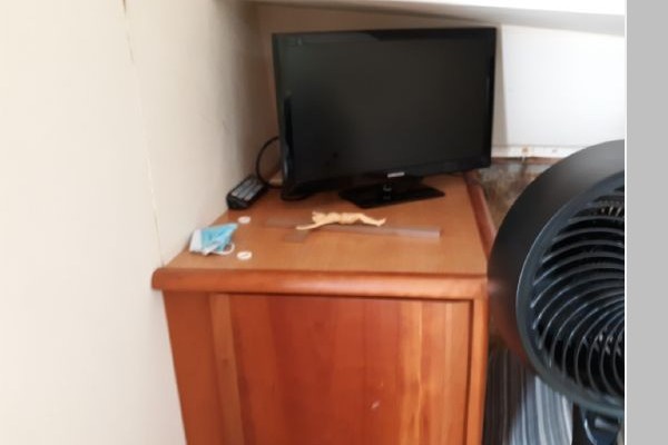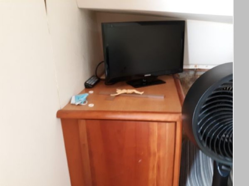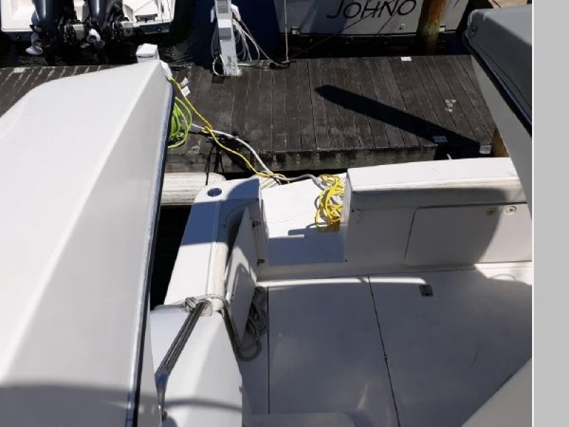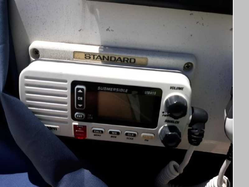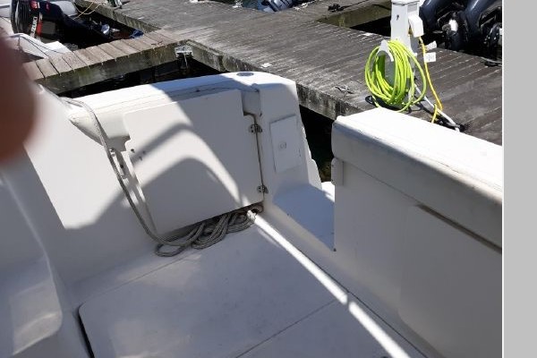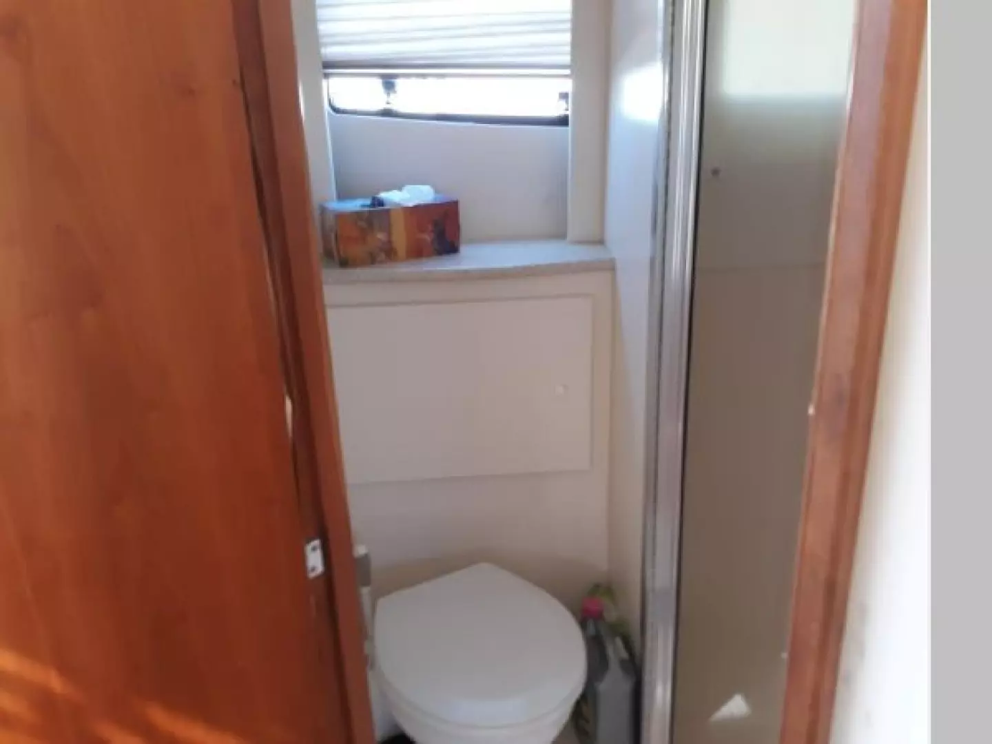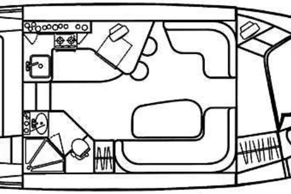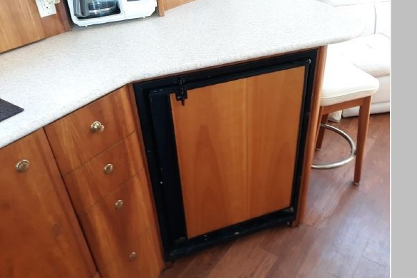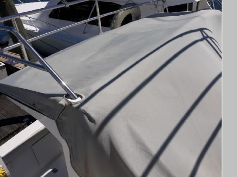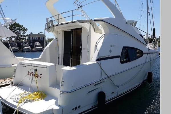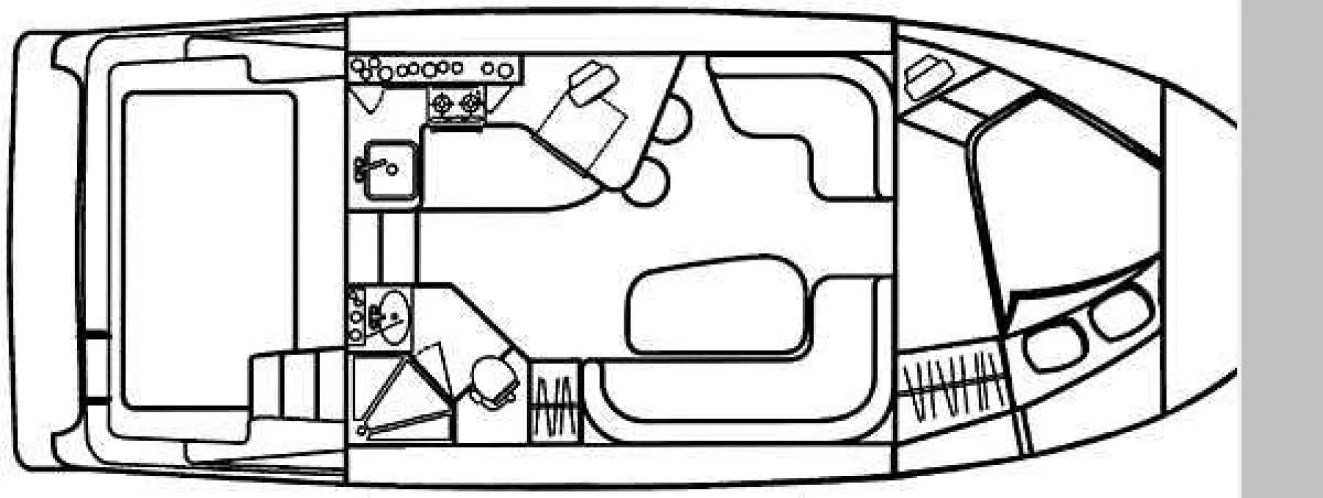 The unusually spacious, full-width interior is all on one level and can sleep 4. The salon headroom is unbelievable! Along the port-side is a huge galley with large, Corian countertops, lots of cabinets and a good-size breakfast bar with two stools. Forward, in the corner is a comfortable built-in reclining seat. On the starboard side is a roomy head compartment with vanity, sink, electric marine head and a large stall shower. Next is a large L-shape dinette with Ultra-leather cushions and a long, solid cherry table. The dinette can convert to sleep two. Further forward is the private master stateroom with a double berth (with inner-spring mattress), sliding privacy door, cedar lined hanging locker and additional storage. The air-conditioned interior is carpeted and finished in rich cherry cabinetry. Large windows on three sides provide plenty of natural light. There is an AM/FM/CD stereo system and wiring for cable TV.