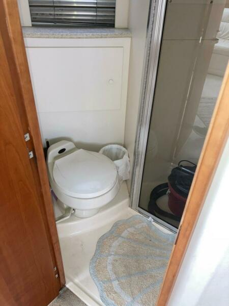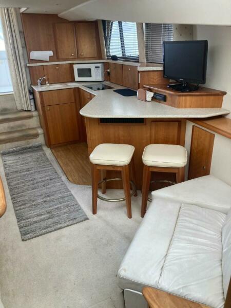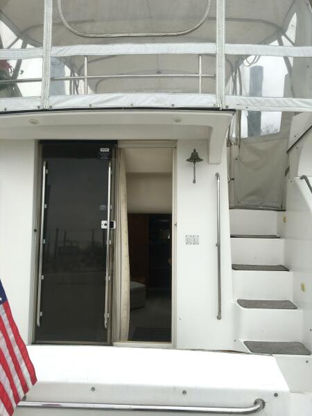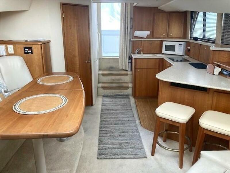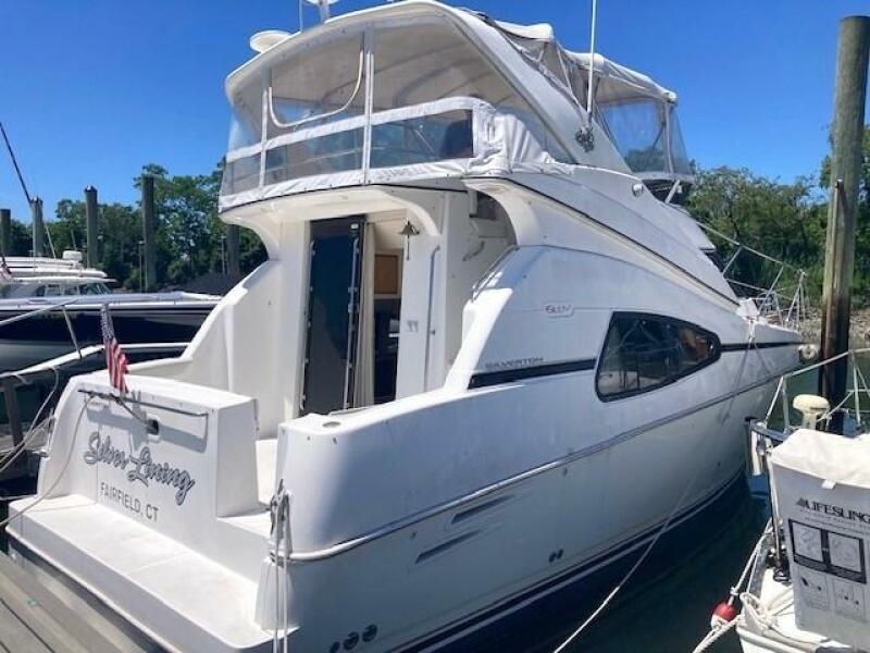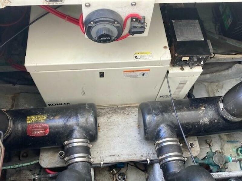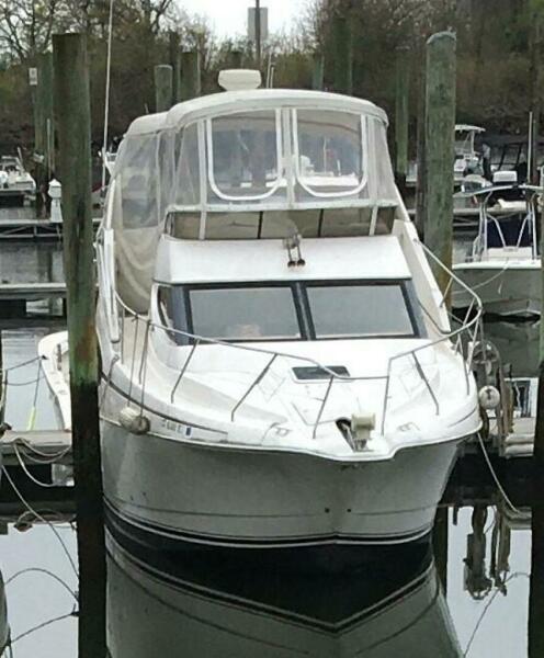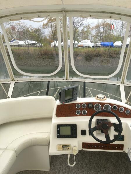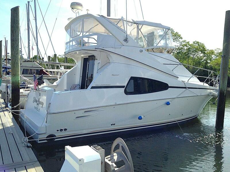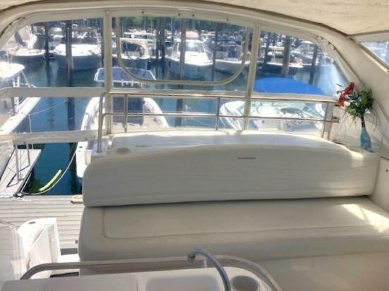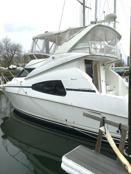 An unusually spacious, full width interior is all on one level and can sleep 4. The salon headroom is unbelievable! Along the port side is a huge galley with large Corian countertops, lots of cabinets and a good size breakfast bar with two stools. Forward in the corner is a comfortable built-in reclining seat. On the starboard side is the roomy head compartment with vanity, sink, VacuFlush toilet and stall shower. Next is a large L shaped convertible dinette with a solid cherry table. Further forward is the master stateroom with double berth (with inner spring mattress), sliding privacy door, cedar lined hanging locker and additional storage. The air conditioned interior is carpeted and finished in rich cherry cabinetry. Windows on 3 sided provide abundant natural light. Outside, molded stairs provide easy access to the oversized flybridge and Silverton's unique "sidewalk" design provide safe, easy access from the flybridge to the foredeck area. Powered by twin FWC 350hp Mercruiser 7.4L inboard engines. Equipped with a full flybridge enclosure, radar arch, generator, air/heat, GPS/radar, anchor windlass and more.