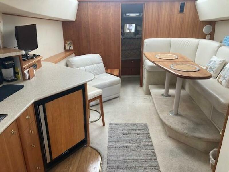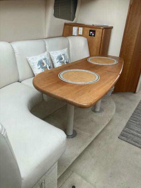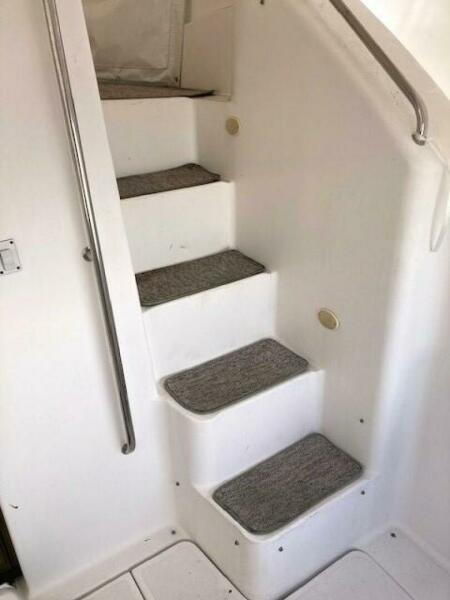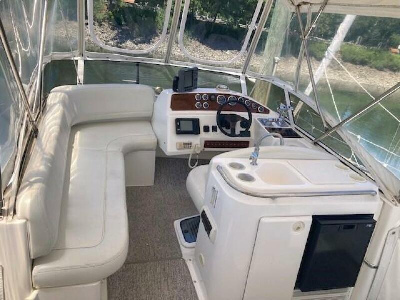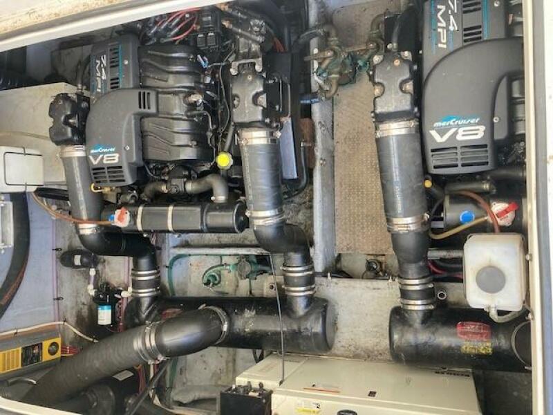 A very spacious family cruiser with the room and amenities of a larger boat. The "Sidewalk" deck layout provides for a full width interior layout and safe, easy access to the foredeck. The molded stairway gives easy access to the large flybridge. Powered with T-7.4 MPI Mercruiser V-Drive inboards.