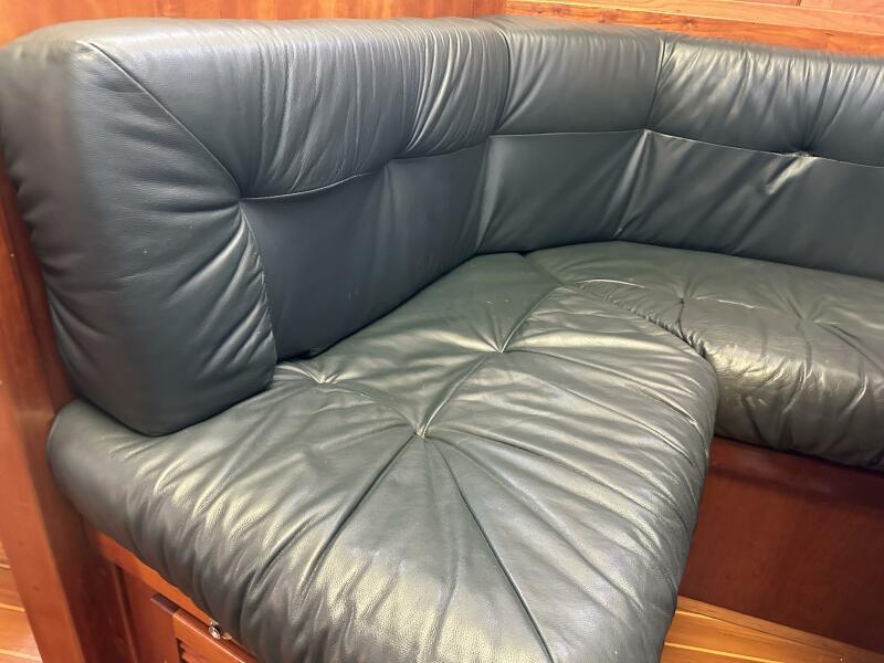 The beautiful blue hull on Braveheart contrasts well with the modest amount of teak which was varnished in November 2025. The cherry salon boasts high quality leather seating and full galley with 2 refrigerators (setup to run as one freezer/one fridge), 4 burner stove with oven, microwave and plenty of counter space.