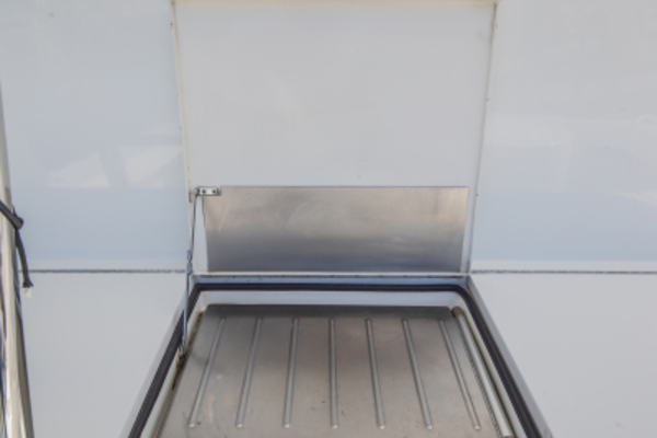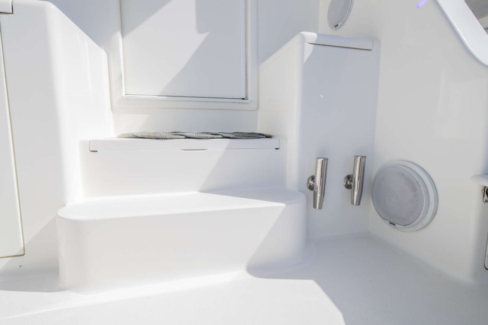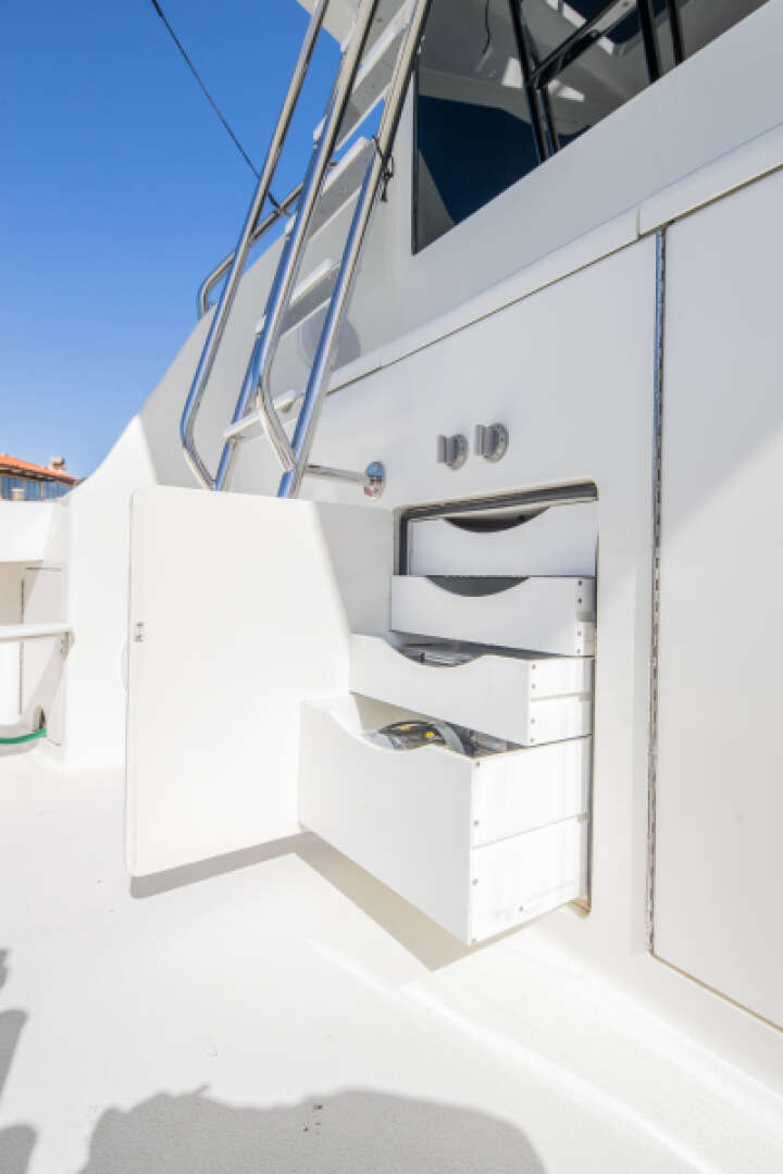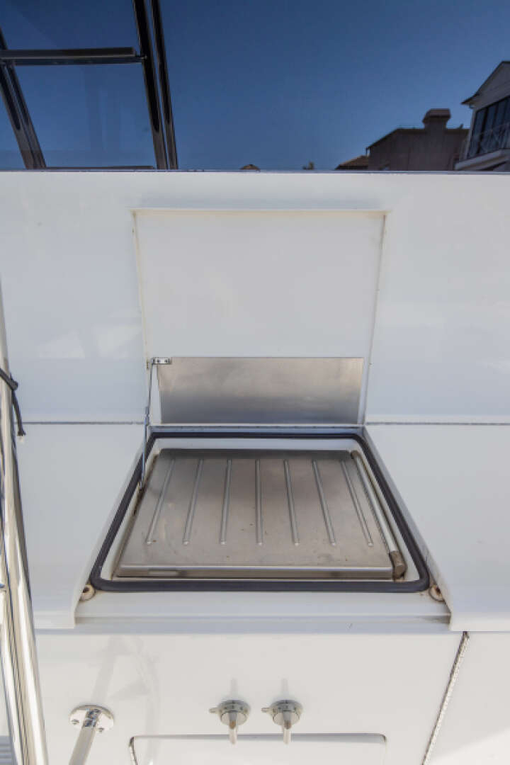 Boasting ample storage and a teak and holly sole, the low-profile galley is portside and forward in the main salon. The four Sub-Zero refrigerator/freezer drawers keep the space feeling open and unobstructed.