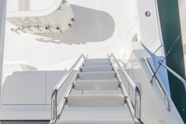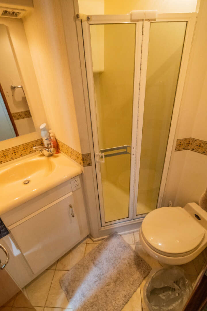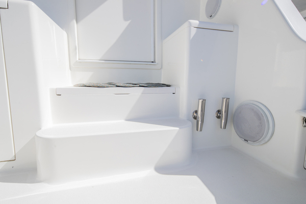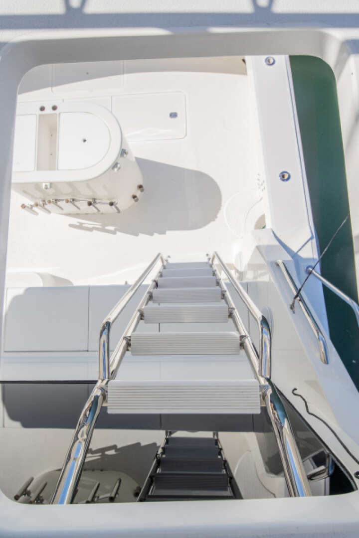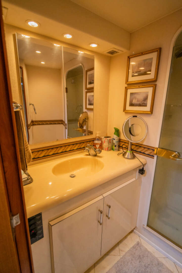 A large guest stateroom is located all the way forward, which has an offset double berth to starboard with a single quarter berth above, to port. There is ample drawer storage, hanging locker, separate air conditioning controls, satellite TV, and ensuite access to private head with stall shower.
