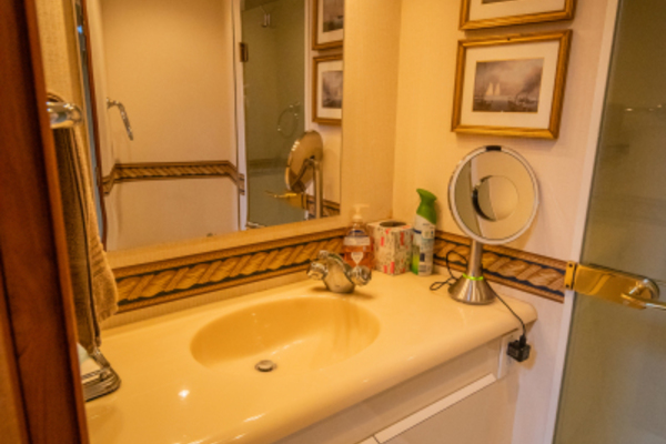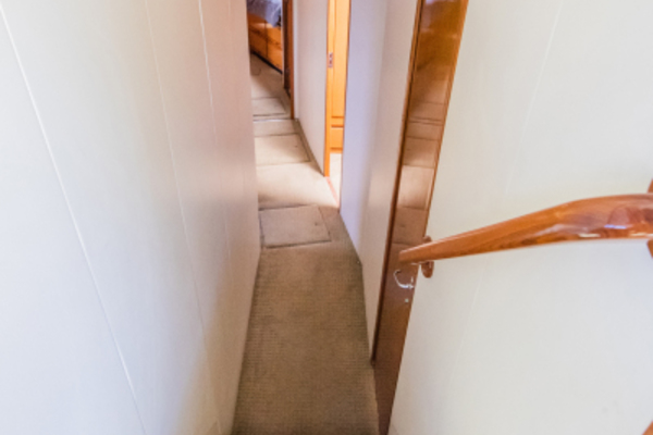 Moving forward down three steps into the companionway, the guest/day head is to starboard, just aft of the guest stateroom. This stateroom consists of an upper/lower berth, a washer and dryer, a cedar-lined hanging locker, and under bed drawer storage with a private entrance in the guest head with stall shower. The master stateroom is located amidships to port and features a walk around queen-sized bed. This stateroom has a large ceder-lined hanging locker, storage under the bed and a credenza with drawer space on the outboard side. The ensuite has a separate full-size stall shower, linen storage, and Vacu-flush head and sink.