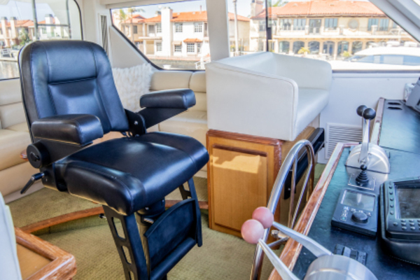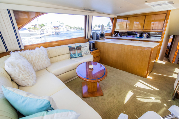 Entering from the cockpit sliding door to starboard is the spacious salon, paneled in high gloss honey teak. The carpeting is neutral tan throughout and all counter tops are white Corian. The dinette and salon tables are teak and the L-shaped settee and the U-shaped dinette are white Ultra-leather. The salon settee is also rod storage.