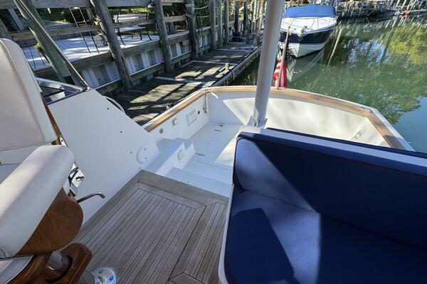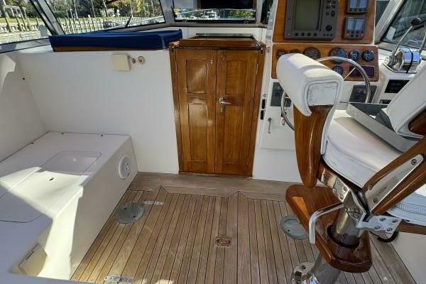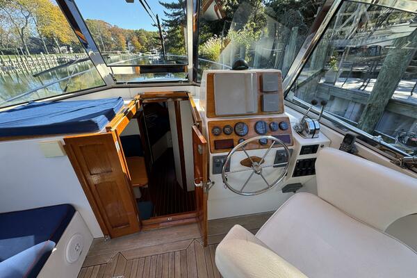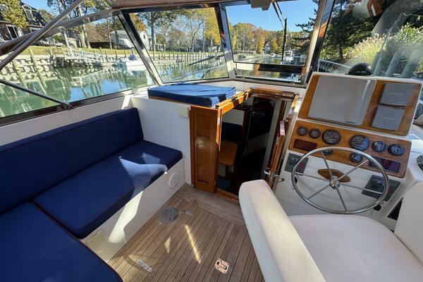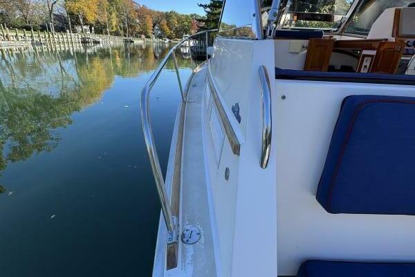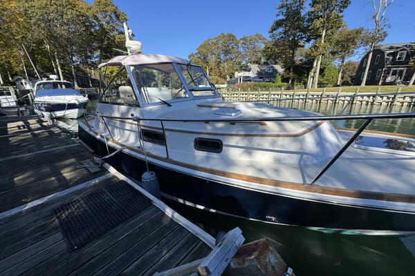 The Blue Star 29.9’s look and price would make a Yankee lobsterman proud said Capt. Stuart Reininger when he reviewed one for Power & MotorYacht in February 2000. She handles well in the sea. Her generous beam and skeg-protected, deep-V bottom contribute to her stability. Wooden touches throughout, such as the solid teak companionway steps and solid (not veneer) cabinetry are of matched, close-grained wood. The helm area layout is straightforward, with a captain’s seat, port-side L-shaped seating, and large analog instrumentation. There is a large cockpit with easy side deck access and aft-facing seating. Below decks have a nice dinette/berth, compact galley, forward V-berth with filler, and a vacu-flush head. She has trim tabs, good electronics, and a nicely crafted teak swim platform. She is a comfortable day-tripper that can easily accommodate six, an overnighter for four, and a weekender for two. She is powered by T-250 HP Yanmars with 760 hours. Check out the Full Specs and call for an appointment to see her.