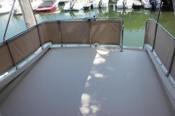 Stainless steel tubular rail and stanchion system surrounds the aft flybridge area